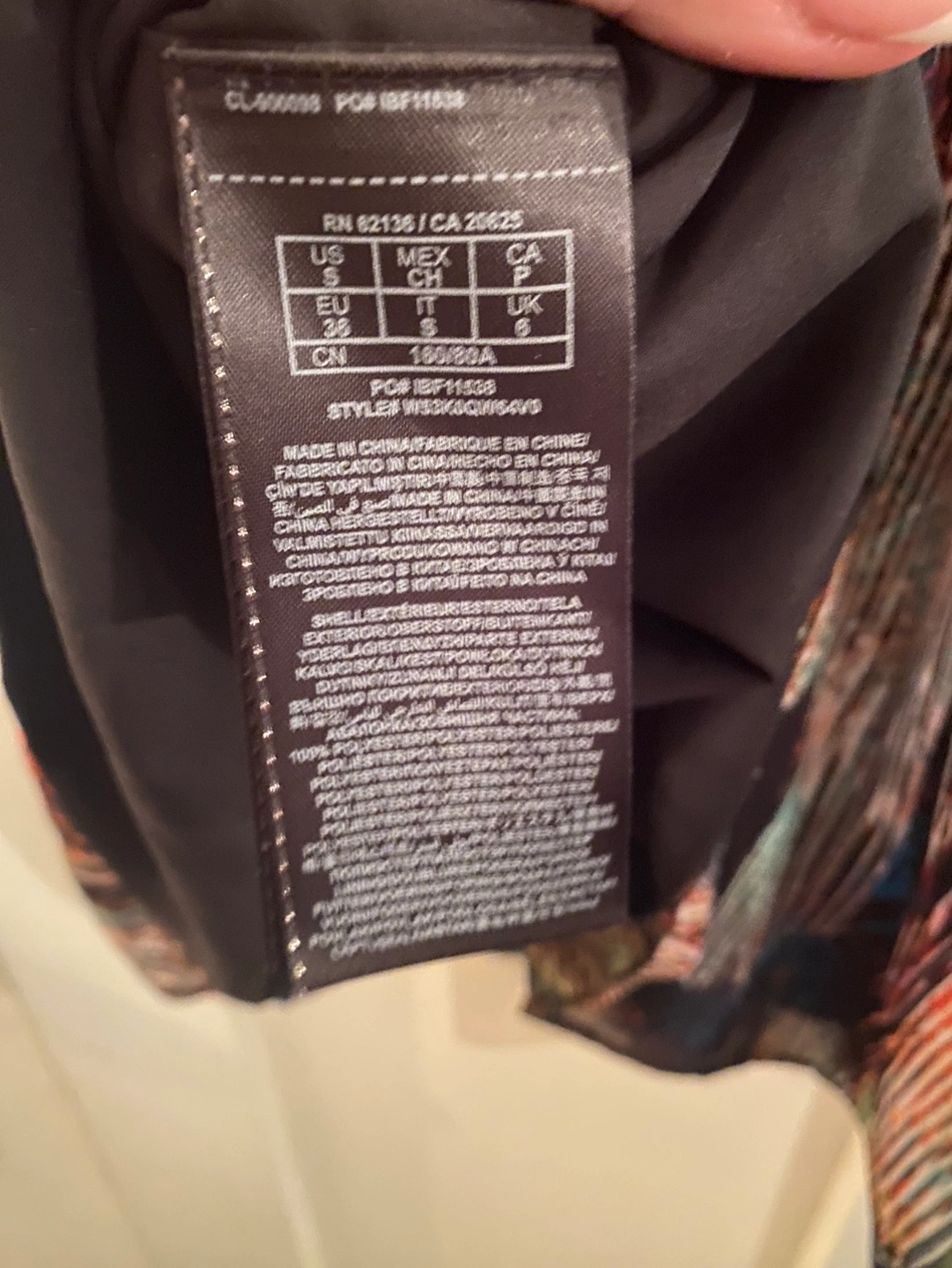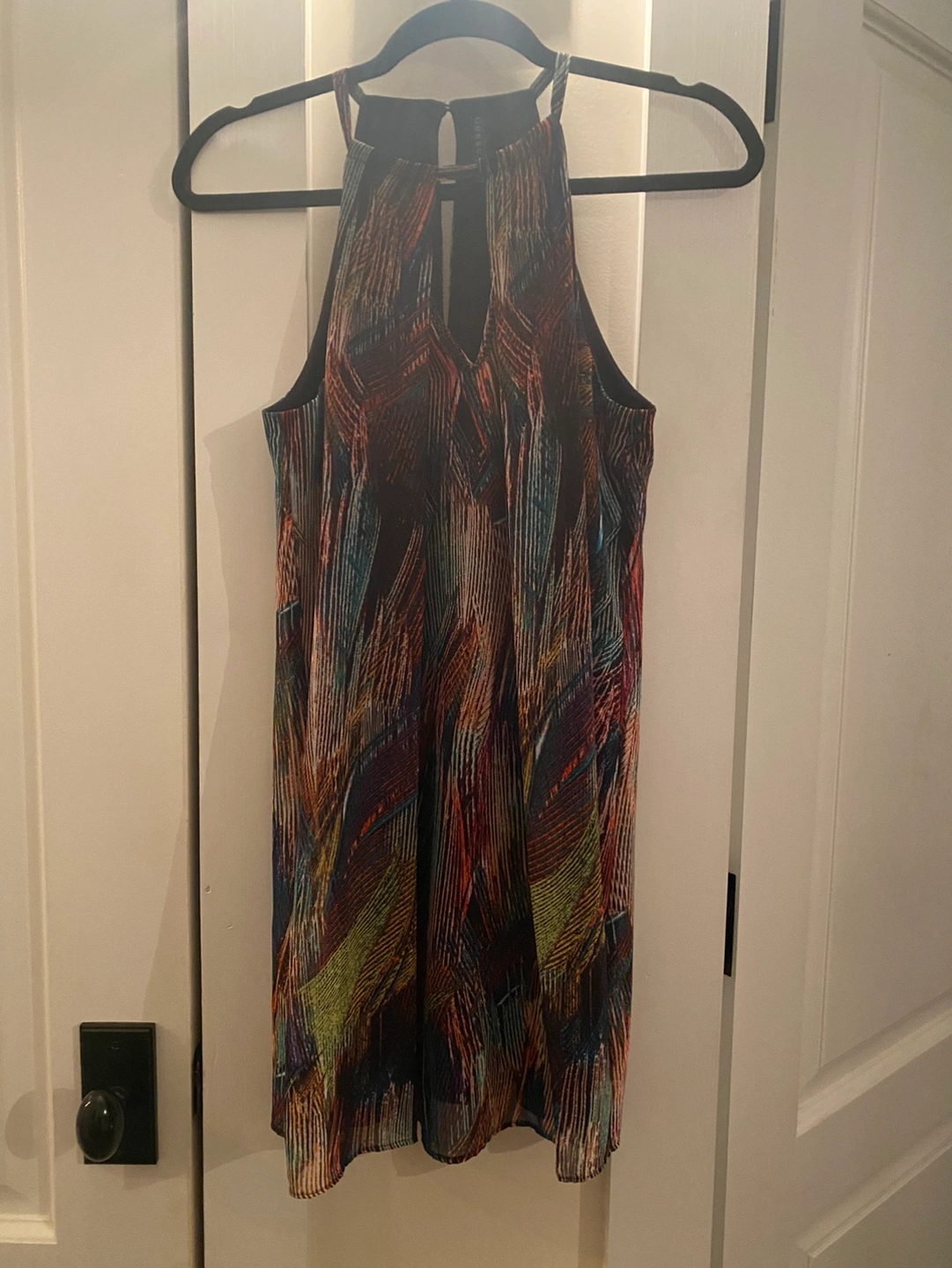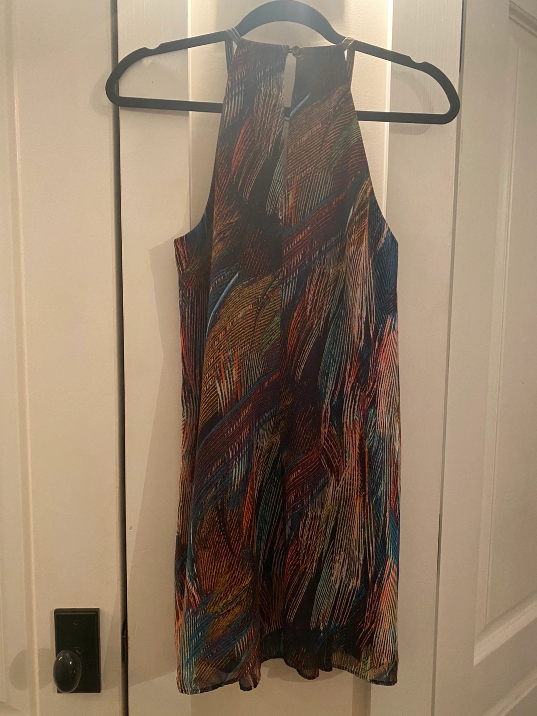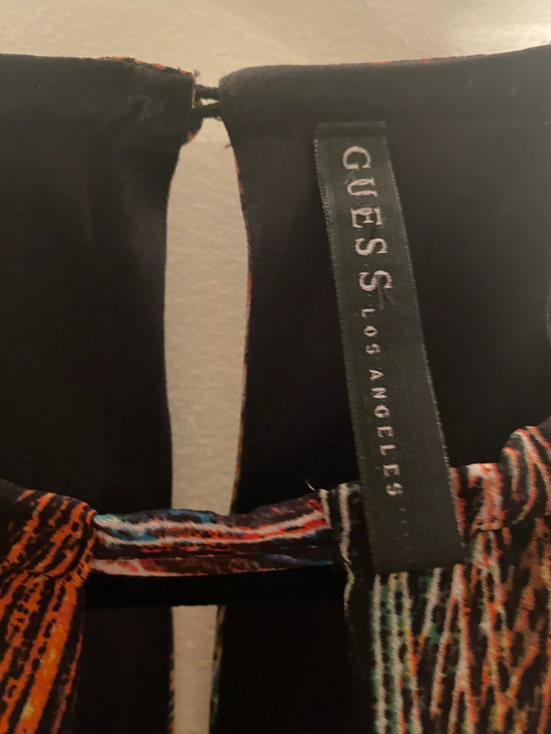 A colourful and stylish dress by Guess in size small with an abstract print. The dress is sleeveless and has a loose fit. It is perfect for any occasion, from a casual day out to a night on the town.