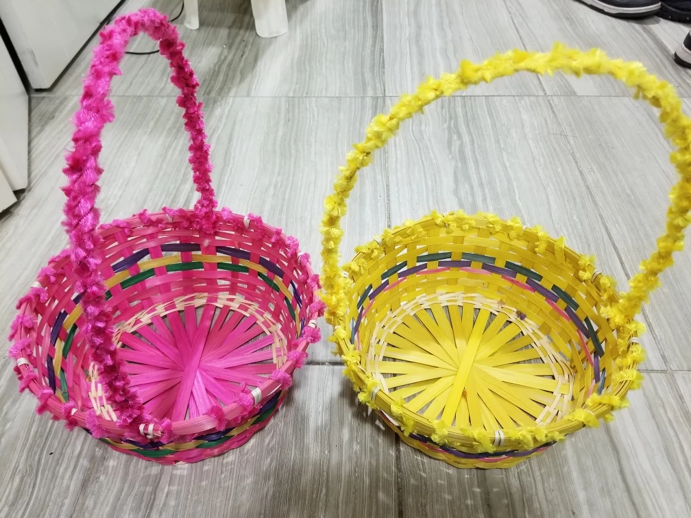 Two woven baskets, one yellow and one pink. Both have fuzzy handles.