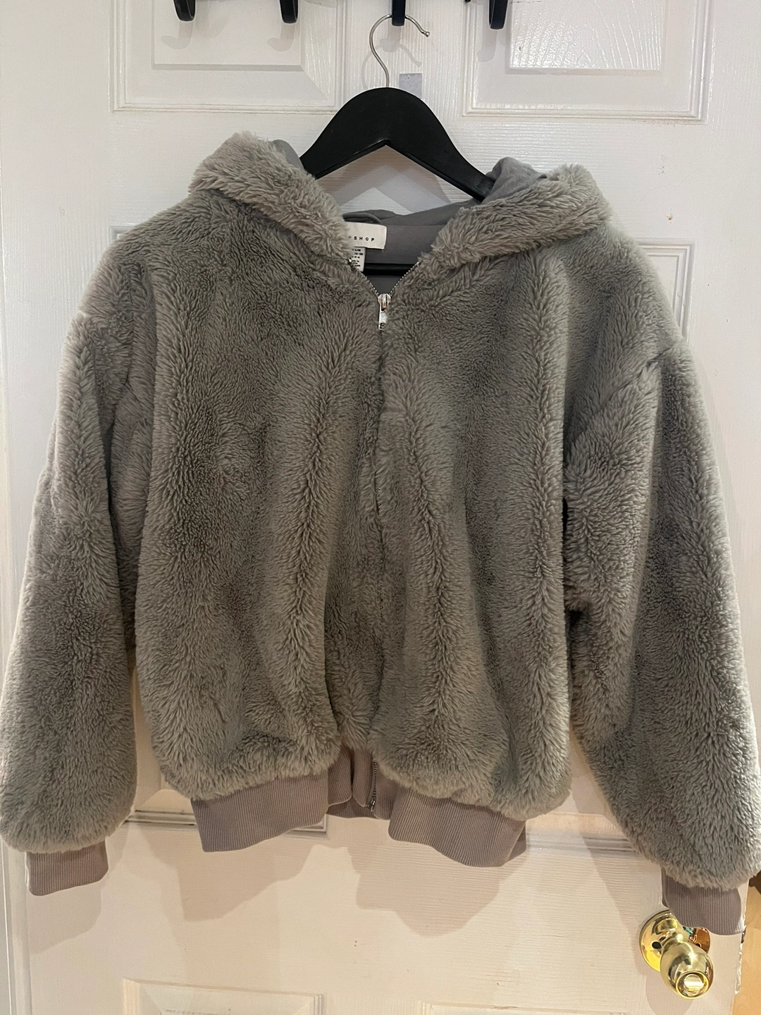 Grey fuzzy hoodie with a zipper closure and a hood. Small size with side pockets