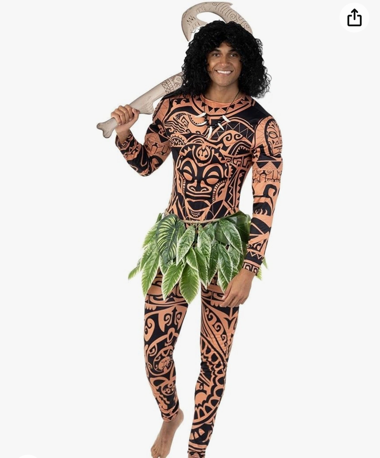 Adult size large costume with a printed tattoo design, a green leaf skirt and a matching necklace. The costume is complete with a hook prop!