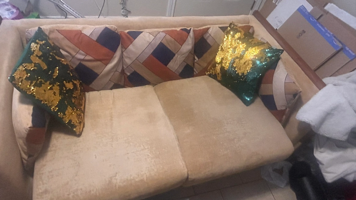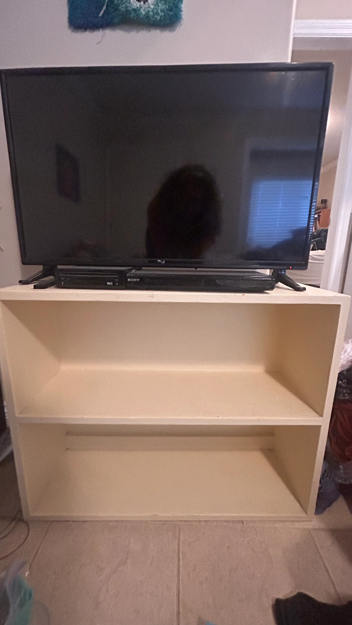 FOR PICKUP ONLY - PM ME FOR EXACT ADDRESS This bundle includes: 1. Well loved, but super cozy couch - sequin pillows included 2. Small coffee table, light and perfect for small spaces! 3. Small dining table (includes 2 dining chairs) 4. Storage cupboard (4 shelves and a drawer) 5. Metal CD/DVD organizer 5. Blue office chair (height adjust feature is broken but in otherwise great condition) 6. Filing cabinet (missing lock) 7. Large bookshelf (books not included) 8. TV stand/shelf - needs painting but excellent otherwise! 9. ROKU smart TV and DVD player