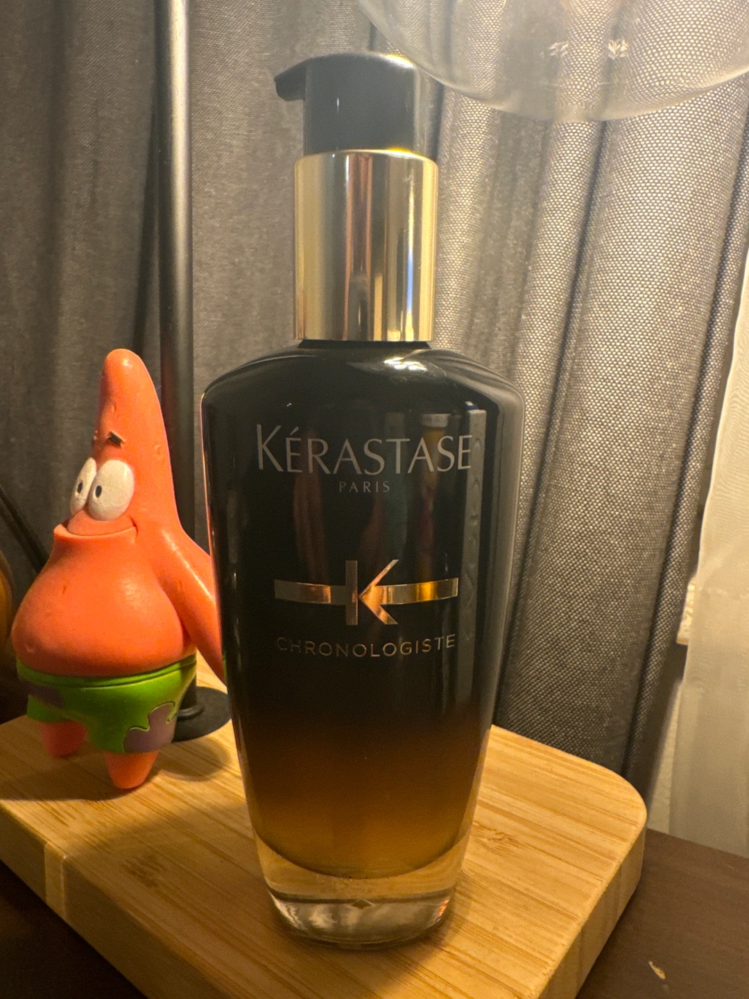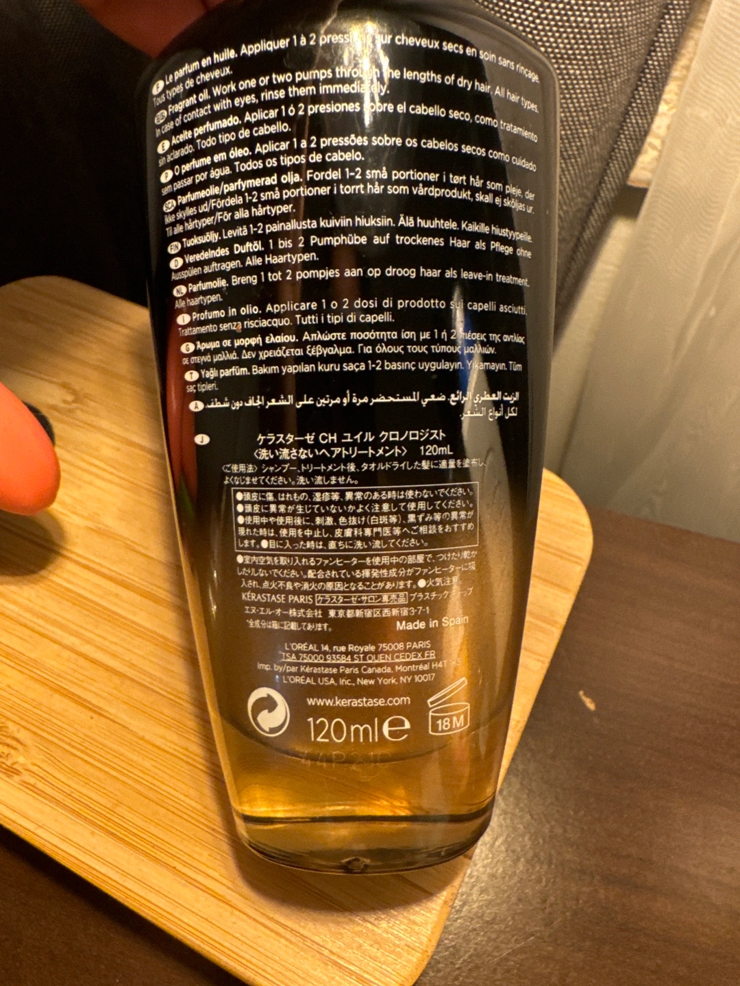 This is a bottle of Kérastase Chronologiste perfume oil for hair . It is 120ml in size. The bottle is almost full.