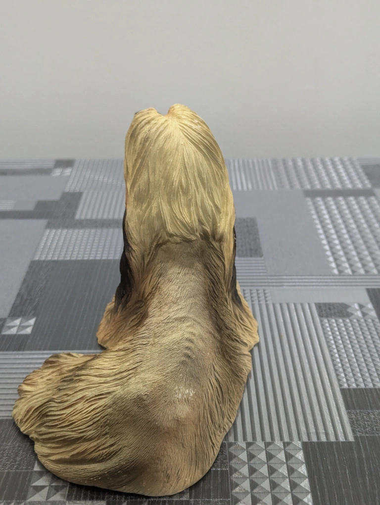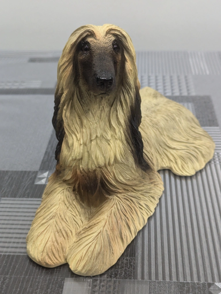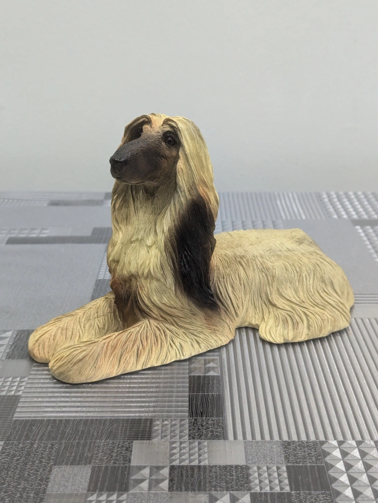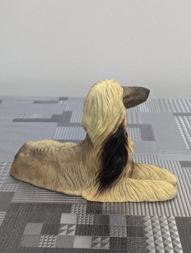 A figurine of an Afghan hound in a lying-down position, measuring 10 inches in length and 6 inches in height. It is in excellent condition.Made in Thailand.