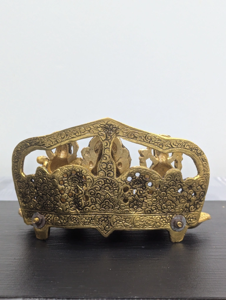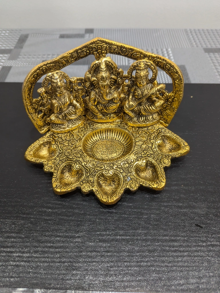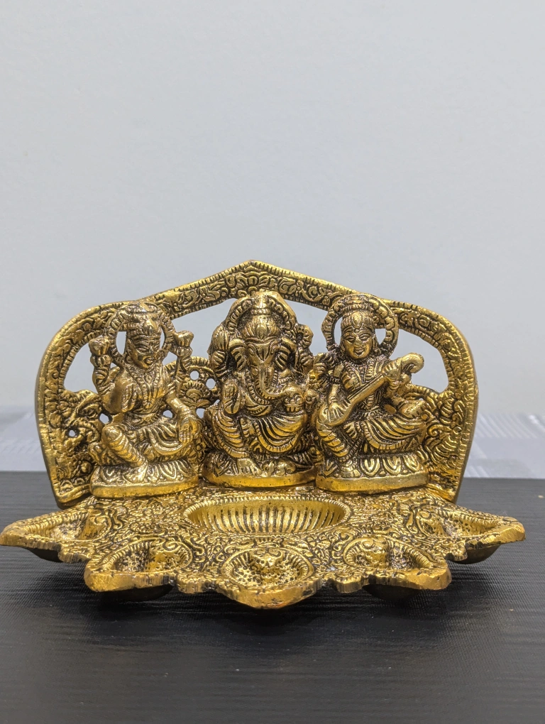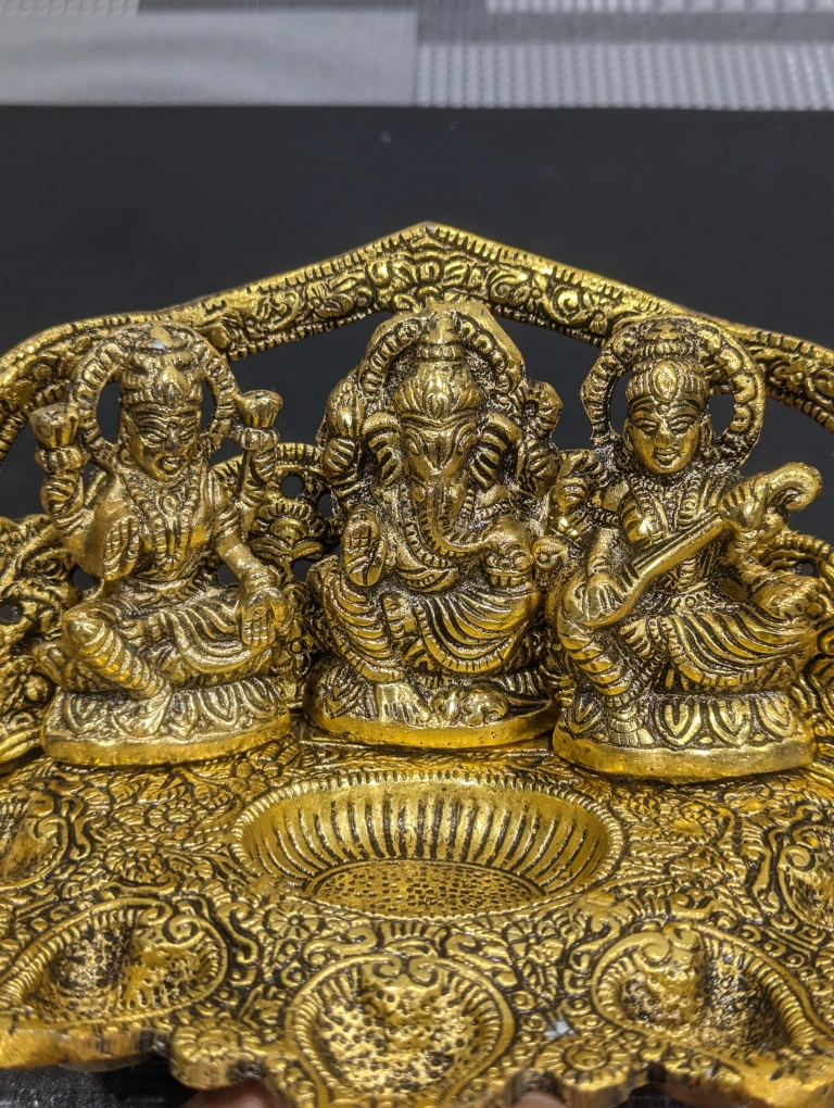 This exquisite, handcrafted solid metal figure of Laxmi, Ganesh, and Saraswati with a Diya brings beauty and spirituality to any home or workplace. Perfect for gifting or enhancing a pooja mandir, this unique sculpture is a stunning addition to any space. Item Dimensions approximately: 21.5 x 14 x 12 centimeters Material: Metal