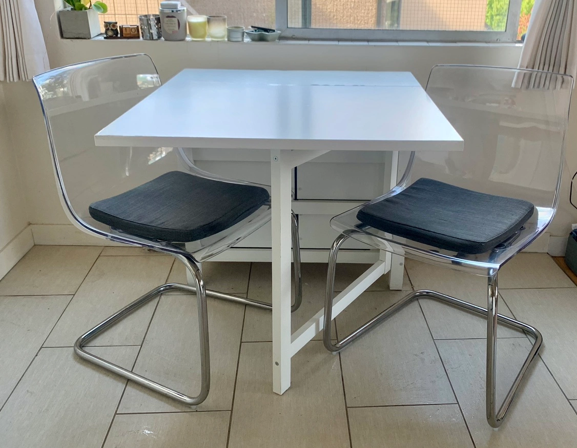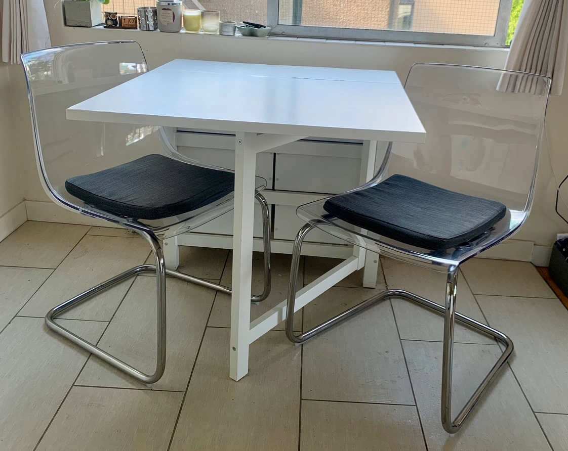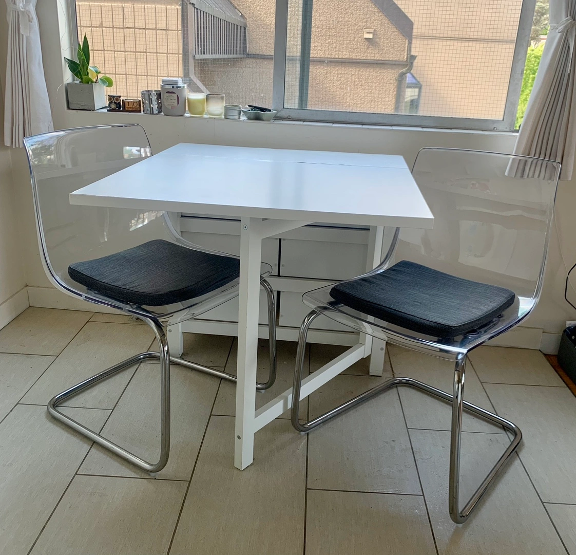 IKEA Dining Set including a Norden Table & 2 Tobias Chairs Hoping to sell as a set for $300 ☺️ The Norden table is in good used condition, has minor cosmetic issues but is fully functional and such a handy piece of furniture if you are in a small downtown apartment. It has 6 drawers (three on each side for extra stowage space), can fold together nicely for easy storage and it can also expand to comfortably accommodate 6 people. If you’re interested in only the table $170 The Tobias chairs are both in excellent condition, no issues at all. If you’re looking to only purchase the two chairs $160 All the information and measurements of the items can be found here: https://www.ikea.com/ca/en/p/norden-gateleg-table-white-10423886/ https://www.ikea.com/ca/en/p/tobias-chair-transparent-chrome-plated-80349671/ Cash or etransfer Pick up in the West End on Barclay Street (Thurlow) Check out my other listings.