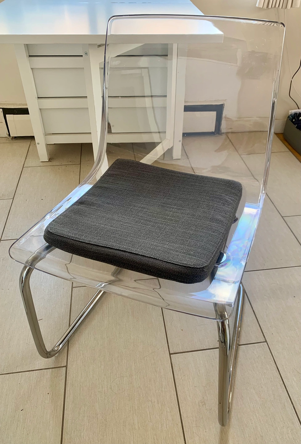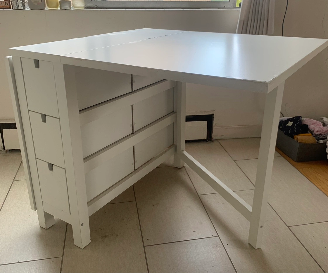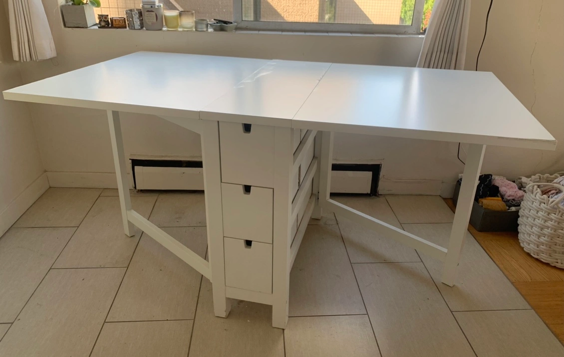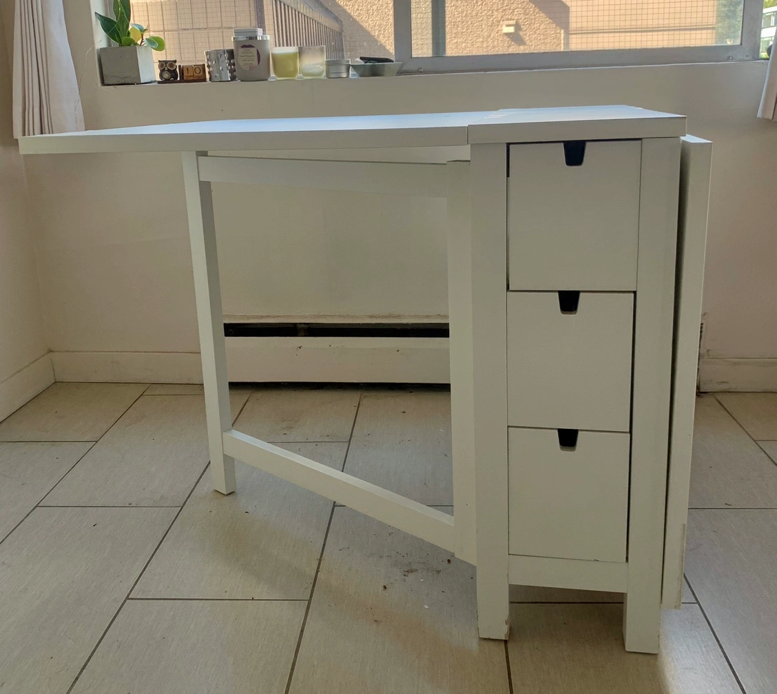 IKEA Dining Set including a Norden Table & 2 Tobias Chairs Hoping to sell as a set for $300 ☺️ The Norden table is in good used condition, has minor cosmetic issues but is fully functional and such a handy piece of furniture if you are in a small downtown apartment. It has 6 drawers (three on each side for extra stowage space), can fold together nicely for easy storage and it can also expand to comfortably accommodate 6 people. If you’re interested in only the table $170 The Tobias chairs are both in excellent condition, no issues at all. If you’re looking to only purchase the two chairs $160 All the information and measurements of the items can be found here: https://www.ikea.com/ca/en/p/norden-gateleg-table-white-10423886/ https://www.ikea.com/ca/en/p/tobias-chair-transparent-chrome-plated-80349671/ Cash or etransfer Pick up in the West End on Barclay Street (Thurlow) Check out my other listings.