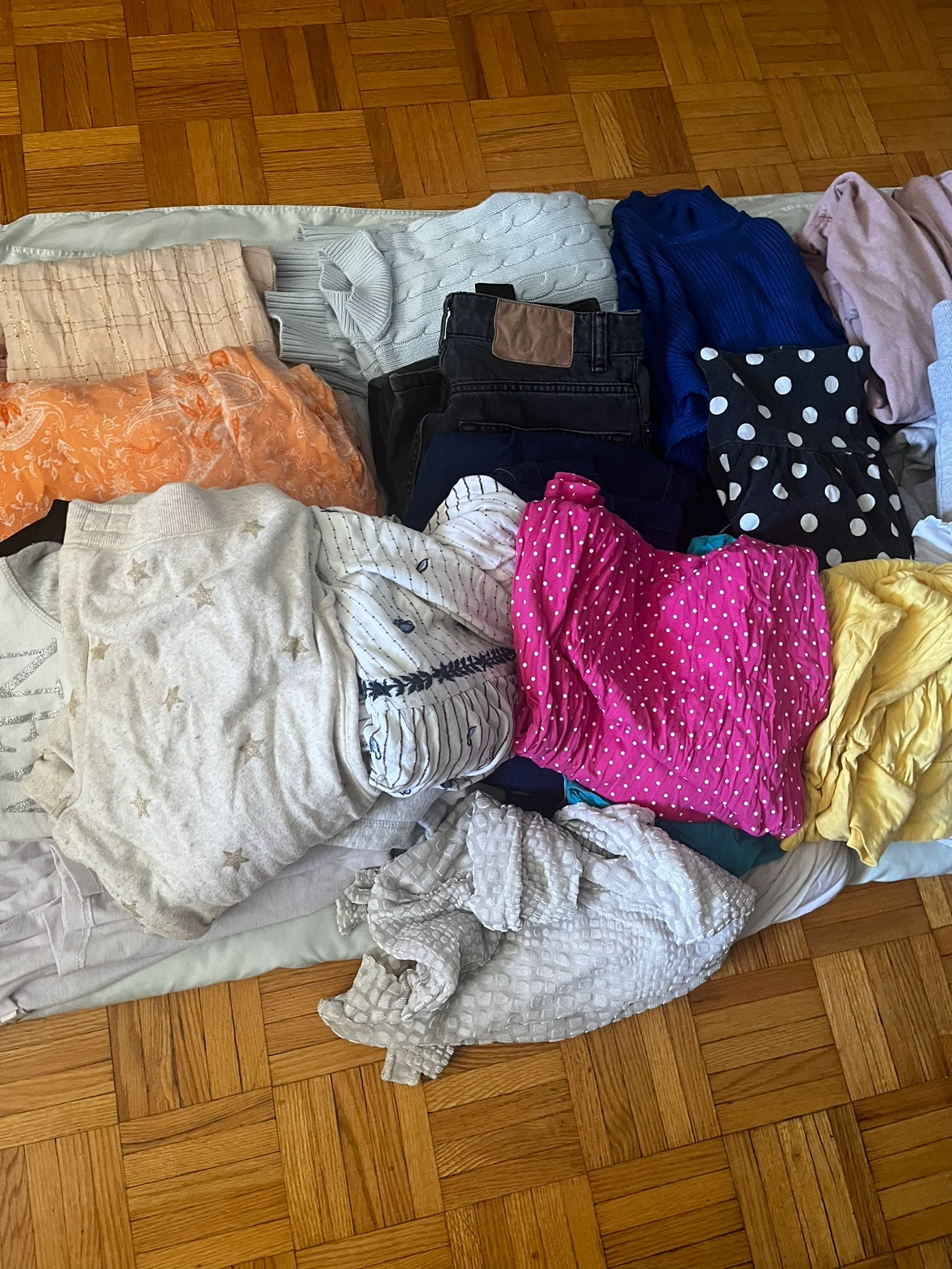 This is a bundle of children clothing that includes tops, sweaters, jeans, and more. All items are in good condition.