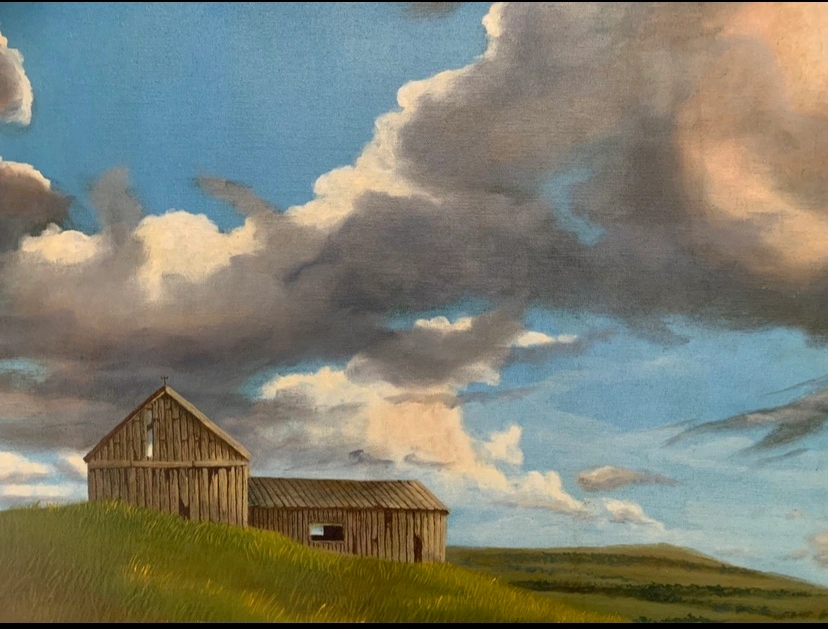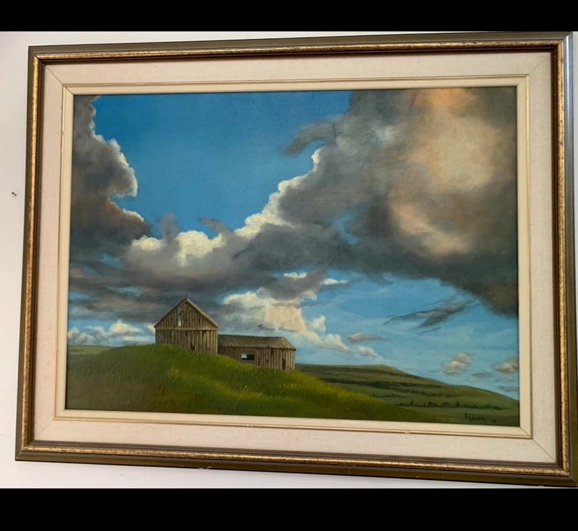 A framed original oil painting of a barn on a hill, signed and dated 'FRASER '78'…width is 37 x 30 inches…(1978)