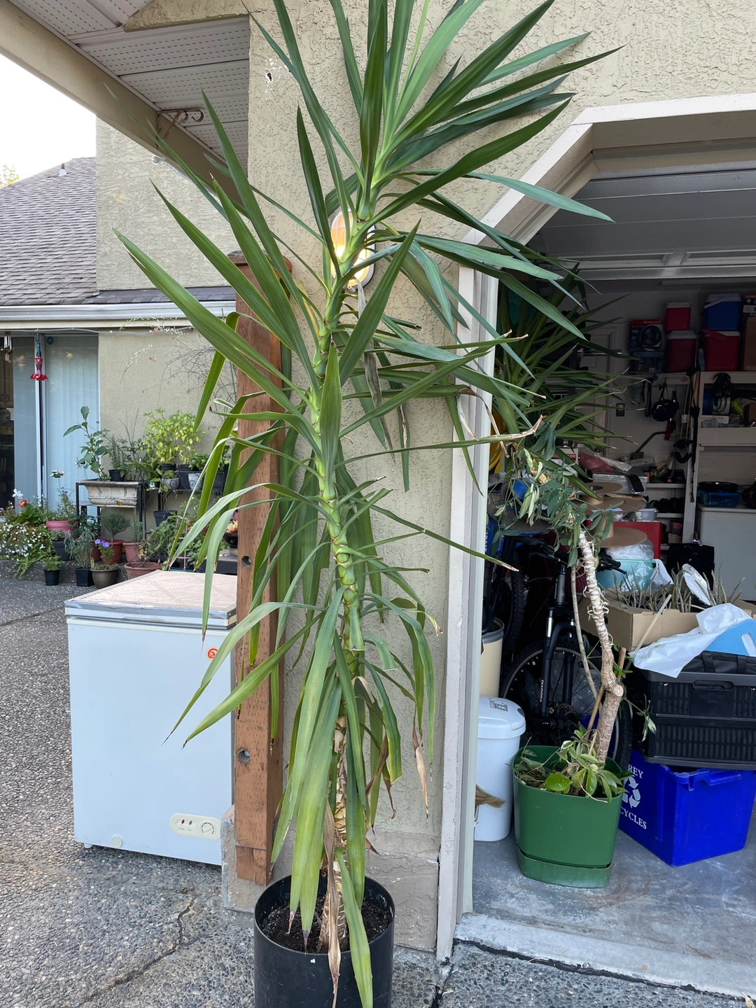 A tall yucca plant in a black pot. The plant is approximately 5 feet tall. Pick up only.