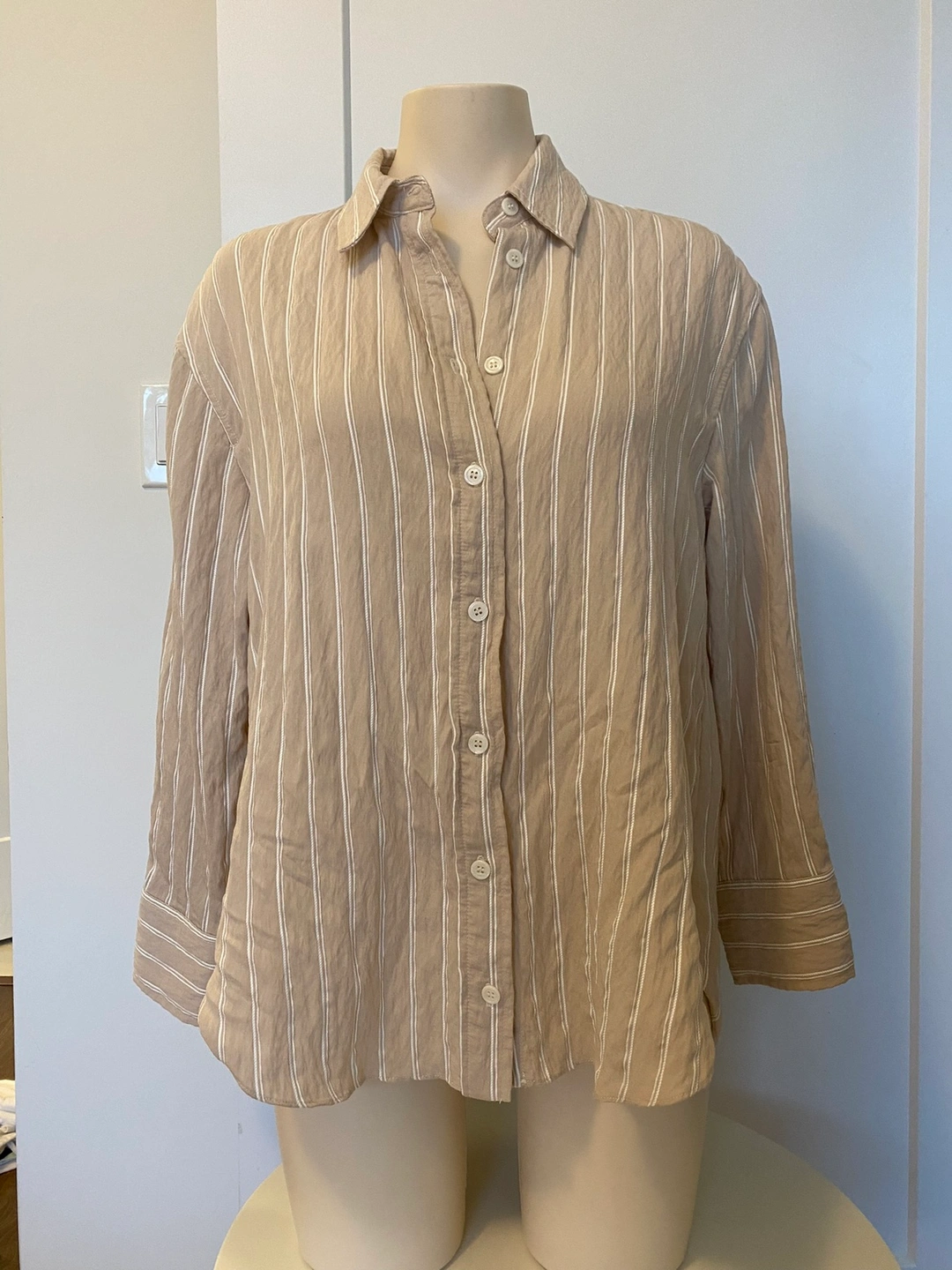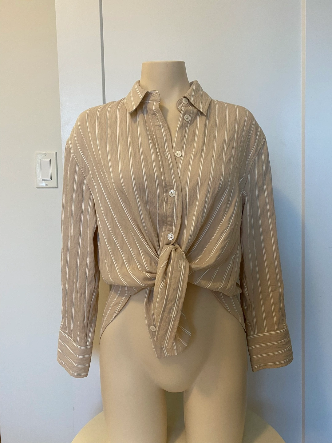 Worn once and washed. A beige button-down shirt with white vertical stripes. The shirt has a relaxed fit and is made of a light woven fabric. Easy to style for business or casual! Cash only. Msg to schedule pick up:)