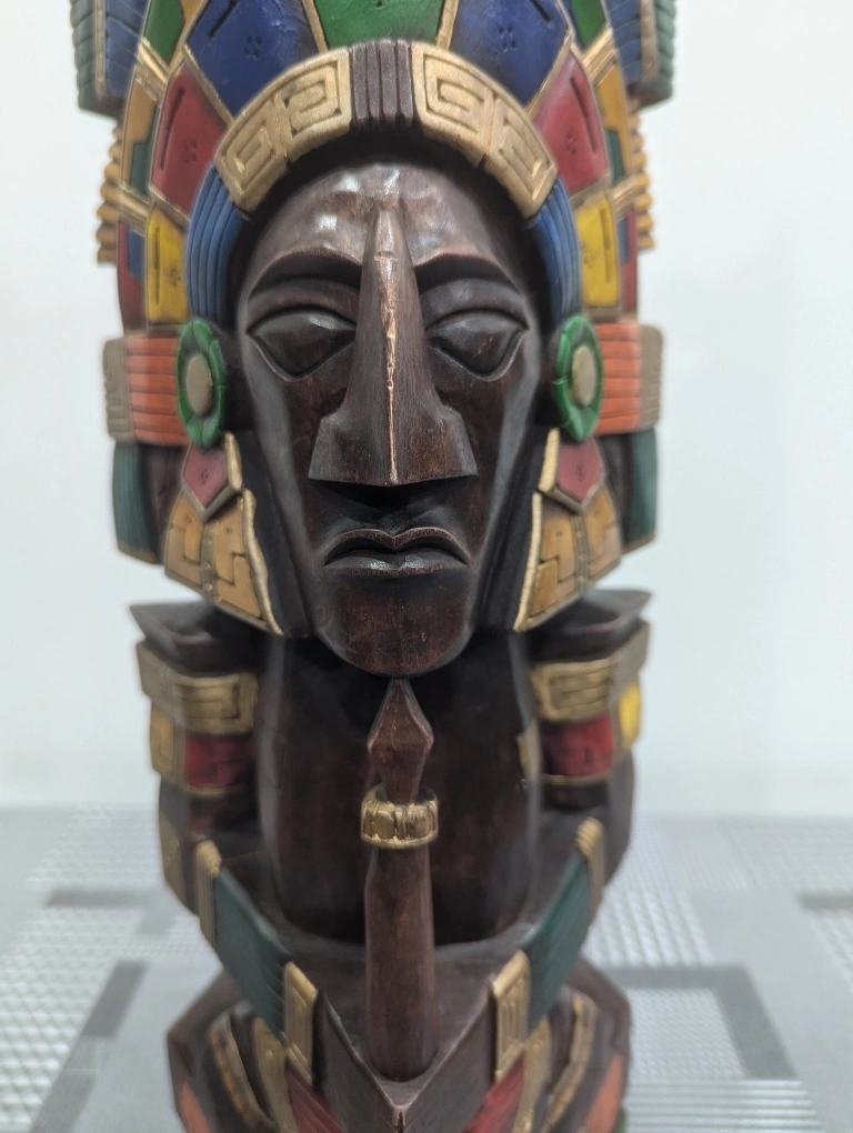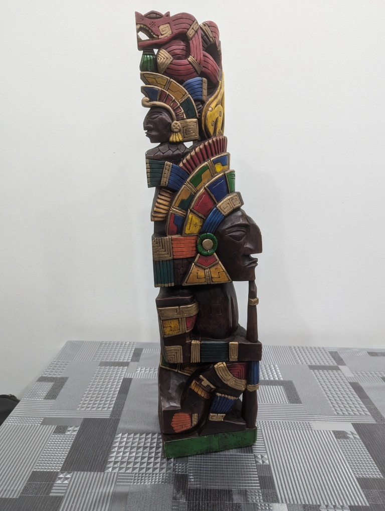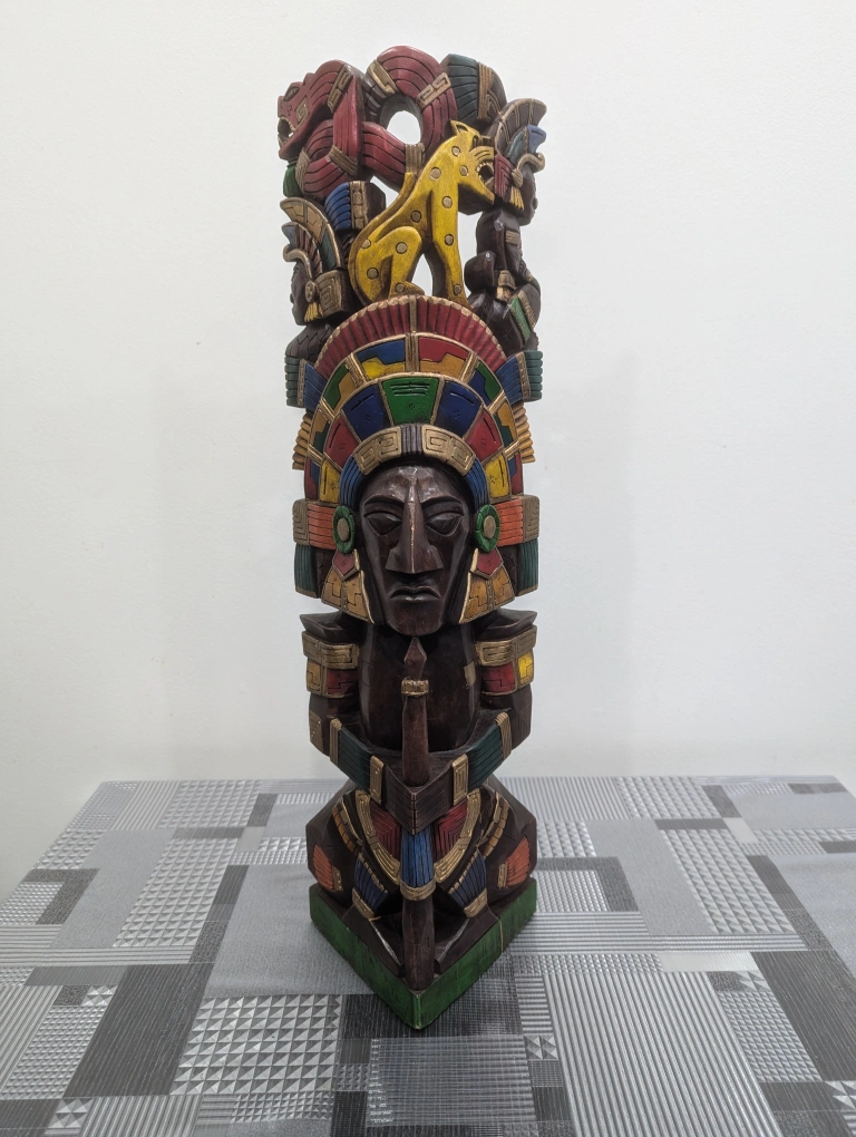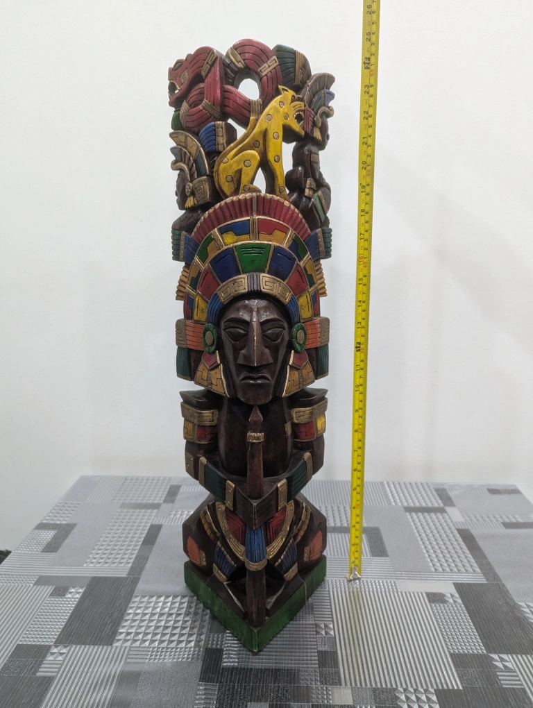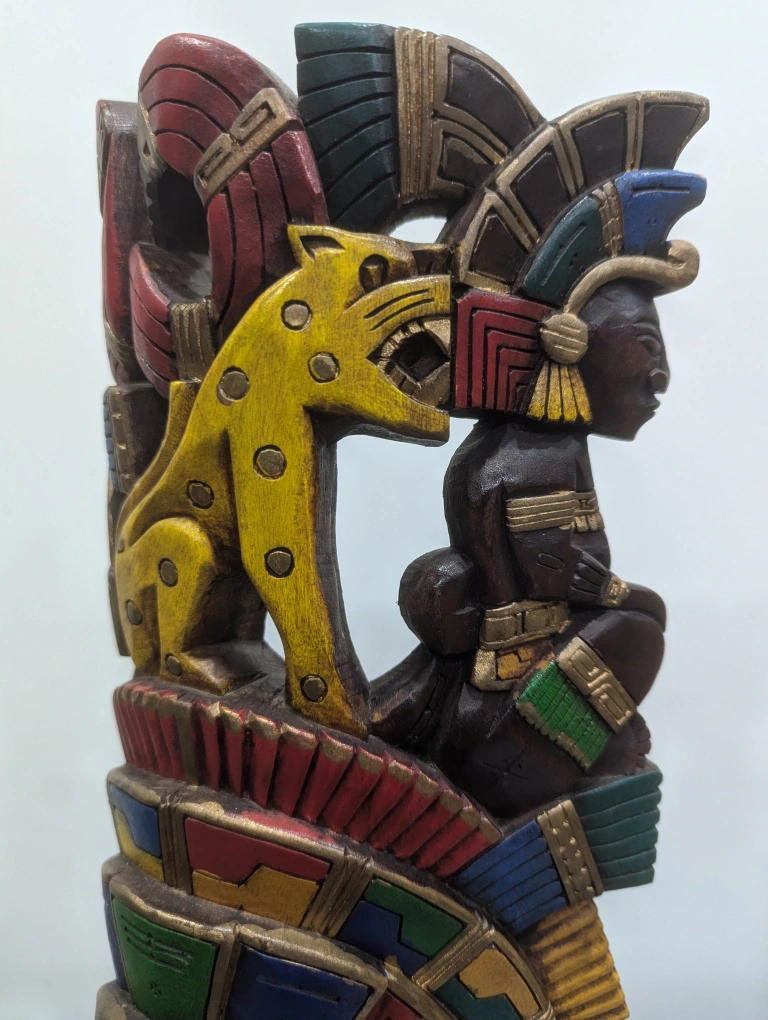 A stunning, hand-carved wooden sculpture featuring an ornate and intricately detailed depiction of an Aztec god. Standing 25 inches tall, the sculpture showcases a headdress adorned with a jaguar, snake, and other elements. The craftsmanship is further enhanced by hand-painted accents, adding depth and vibrancy to the piece.