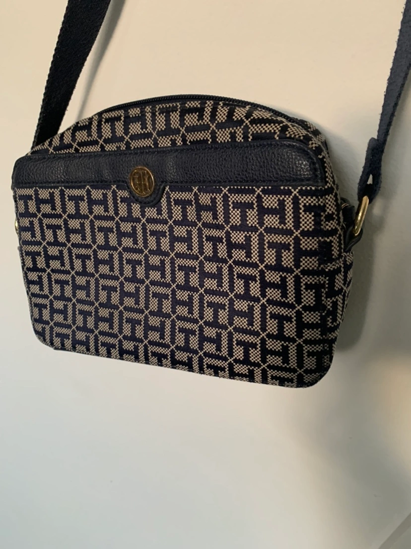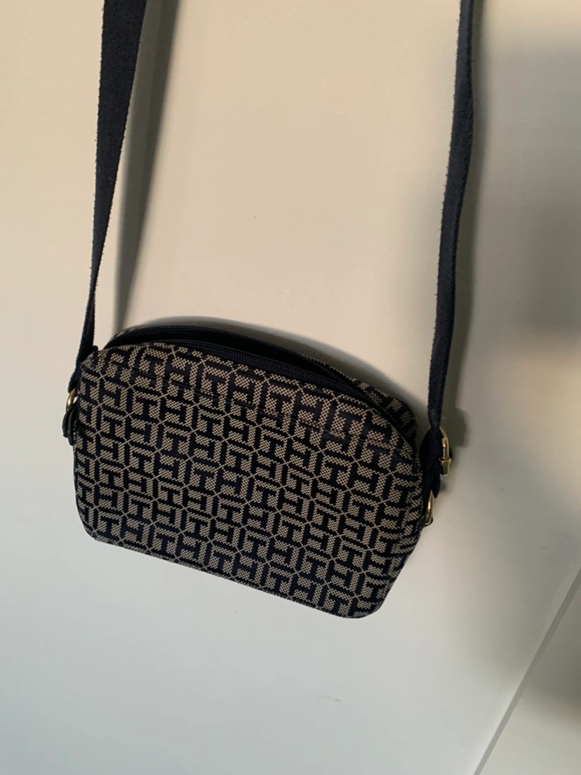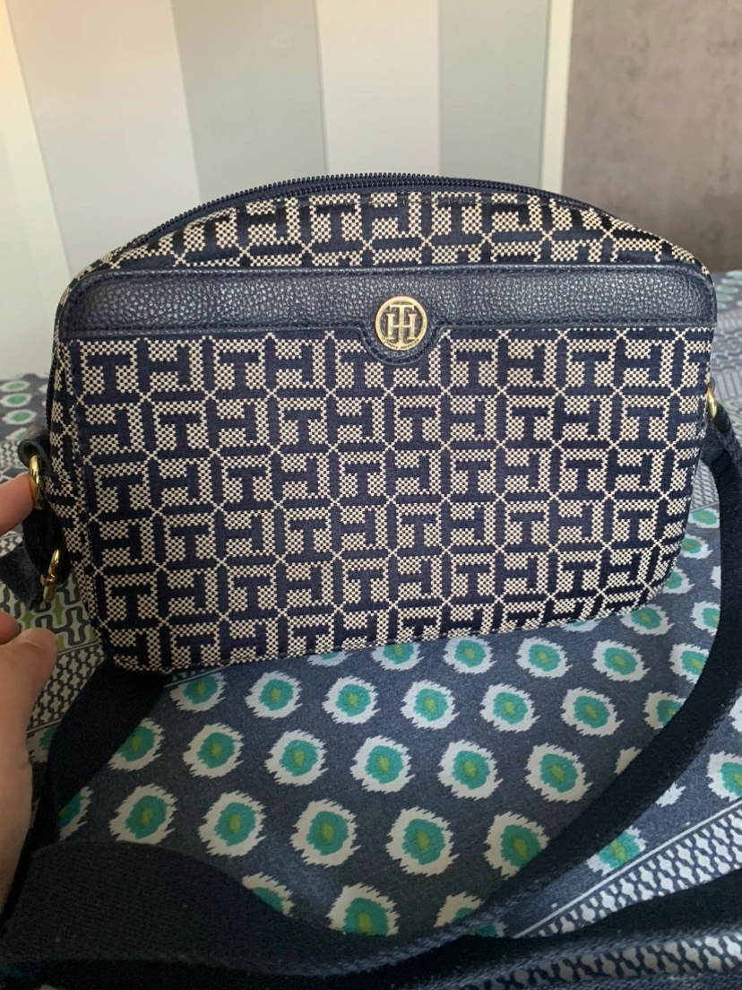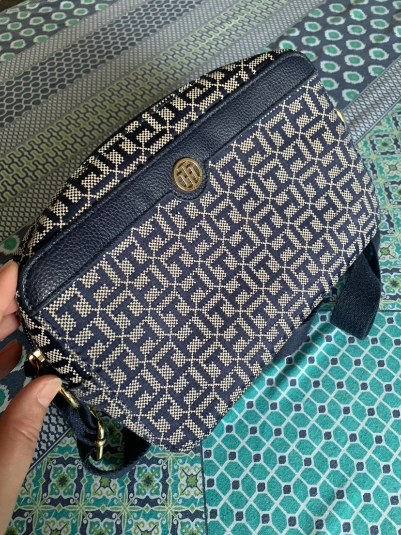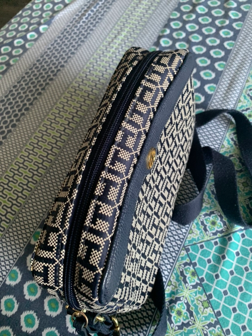 A small, stylish crossbody bag with a navy and cream patterned fabric. It has a gold-tone logo and adjustable strap. Used