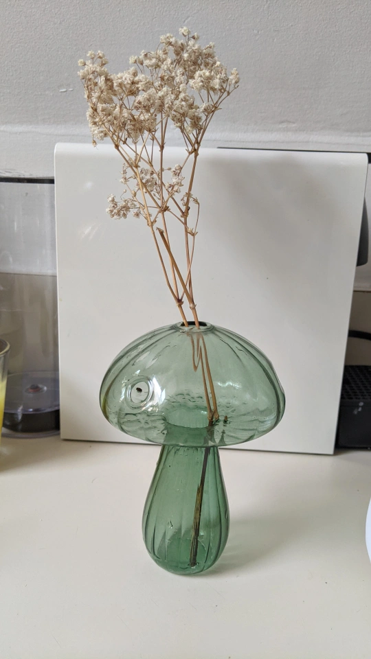 A small green glass vase shaped like a mushroom. It is perfect for displaying small single stems.