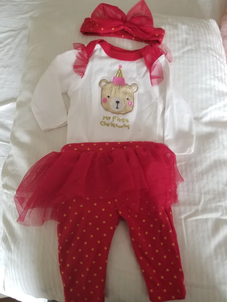 Red and white Christmas outfit for baby girl. Includes headband. Great for Christmas photos!