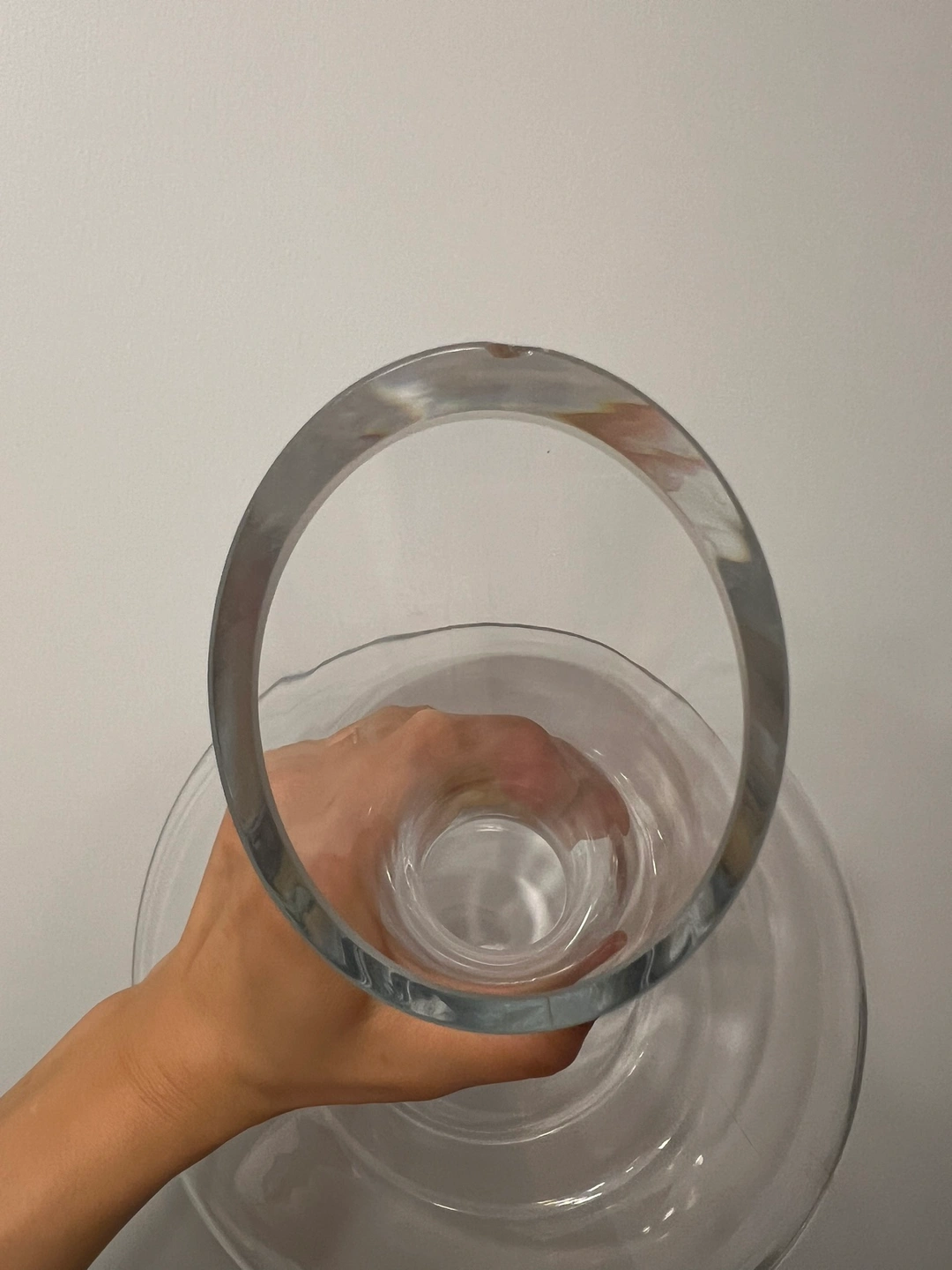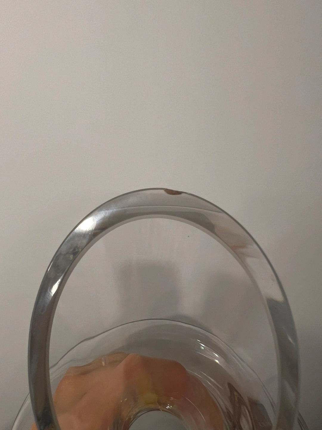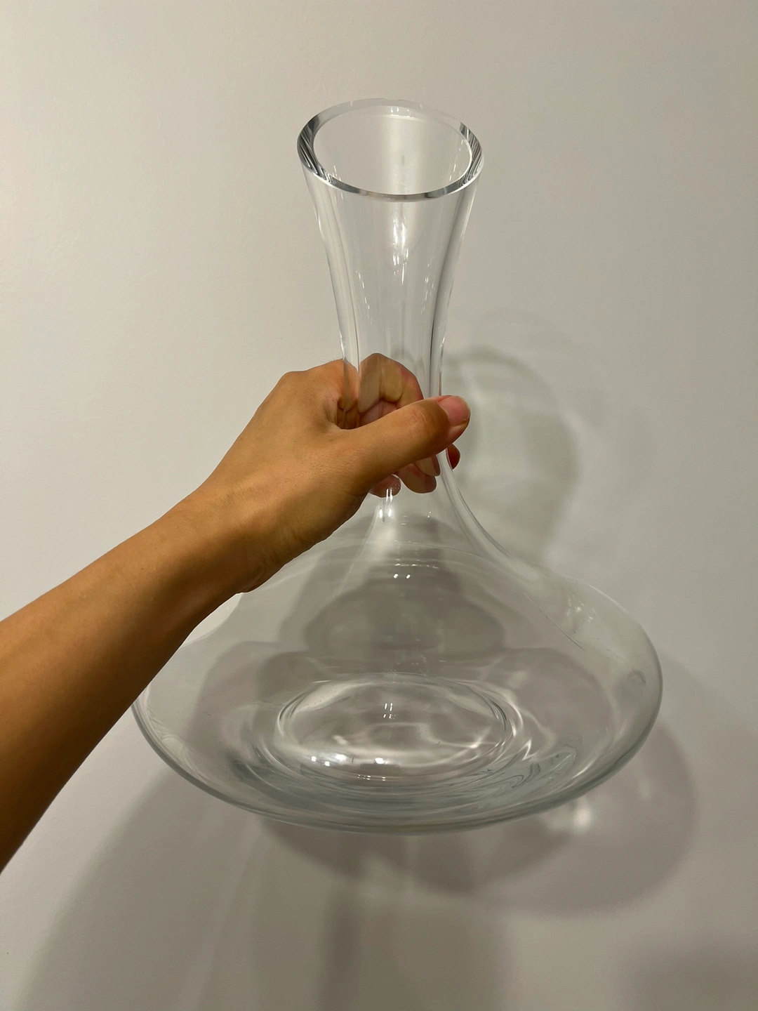Crate and Barrel clear glass decanter with a large base and a handle at the top. Chipped glass on top. Pick up only