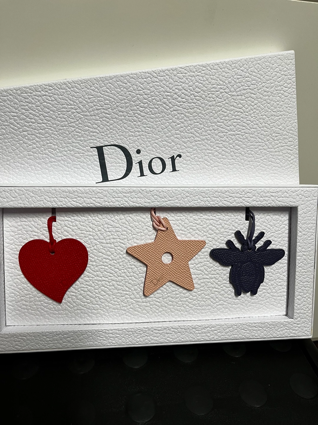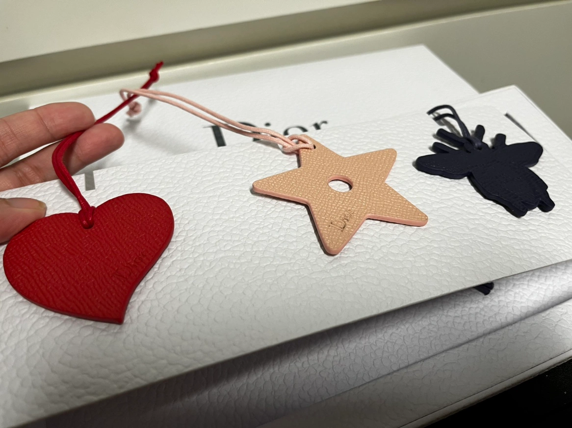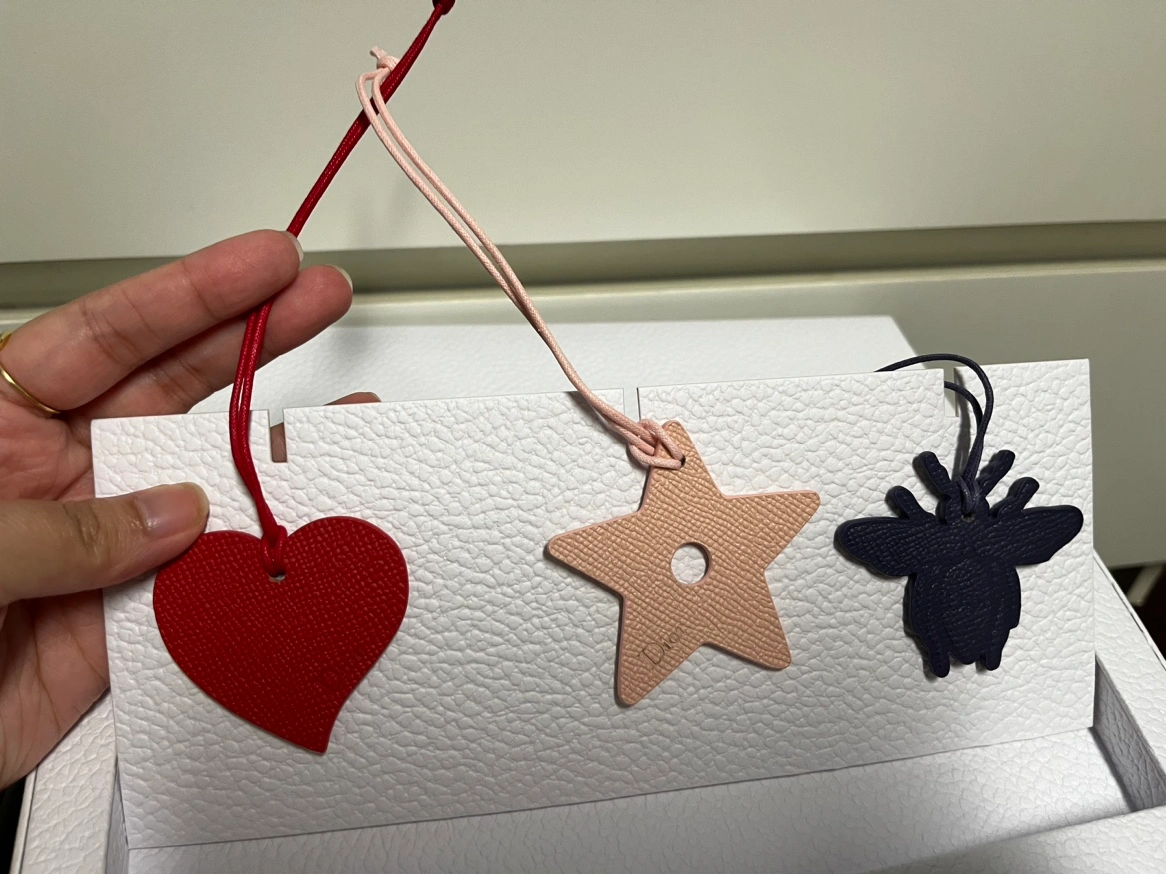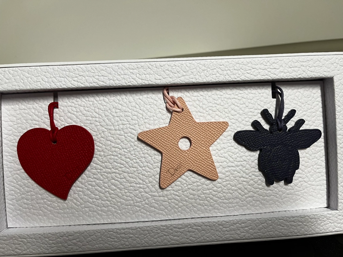A set of 3 Dior charms in a heart, star, and bee shape. Each charm features a different colour and includes a cord for hanging. Comes in the original Dior box.