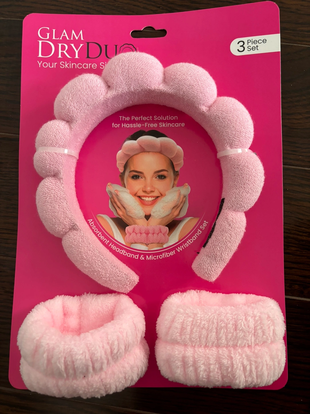 Pink headband and two wristbands perfect for skincare and makeup routine.