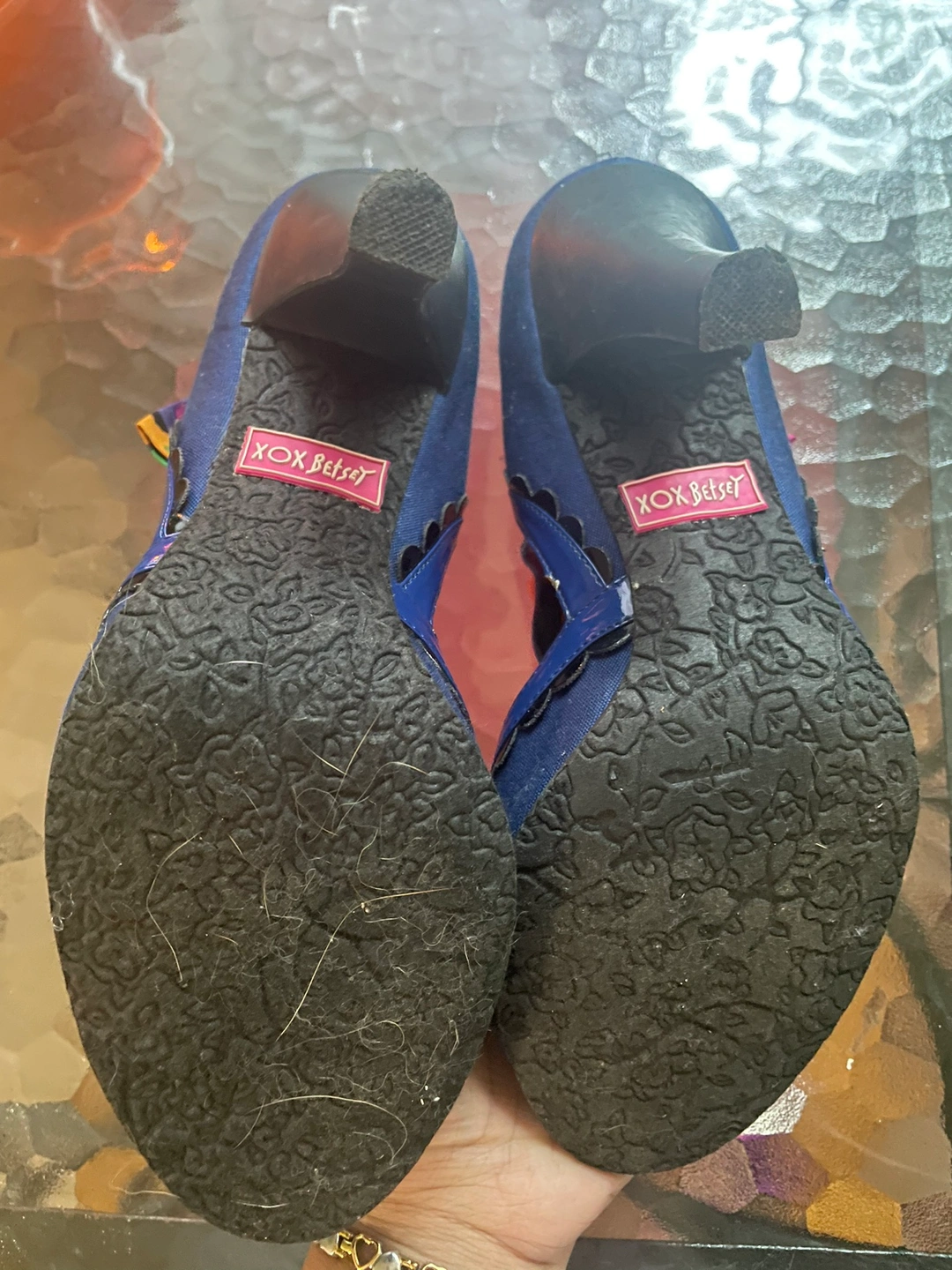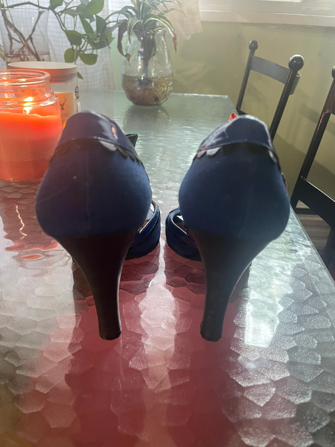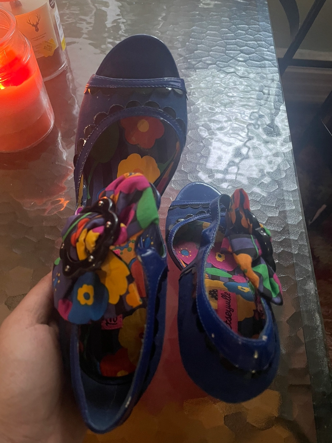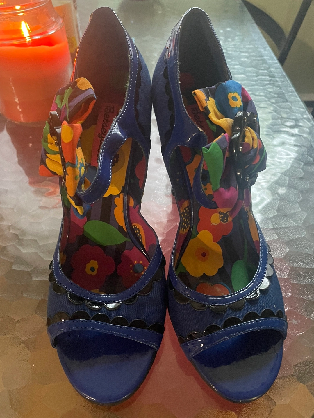 These are a pair of blue heels with a black trim, a bow, and floral patterned lining. They are size 8 Lightly worn, like new