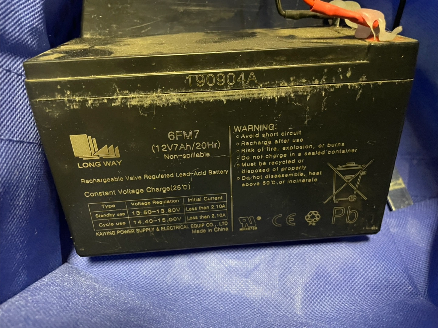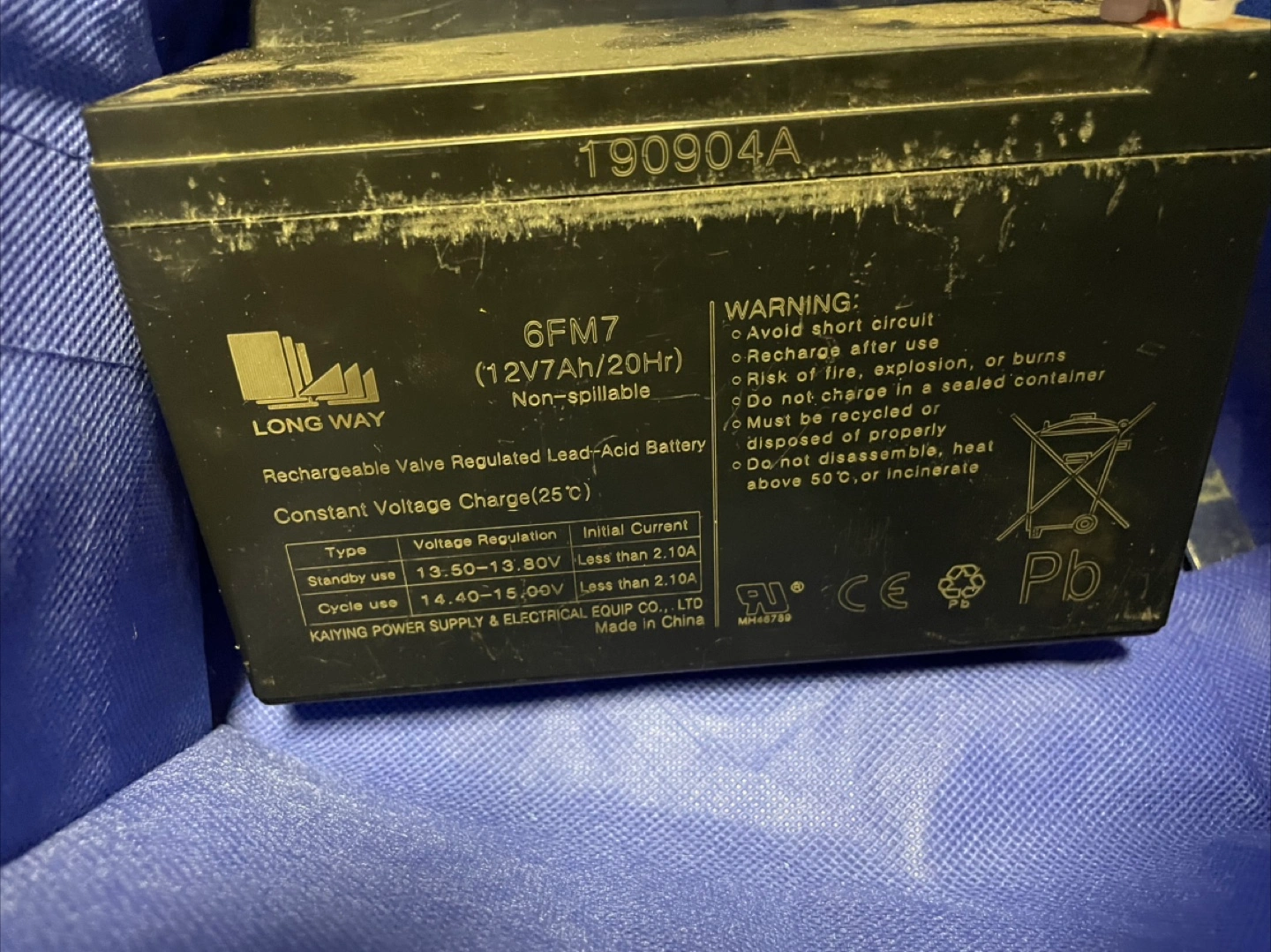 Selling a Long Way 6FM7 (12V/7Ah/20Hr) rechargeable valve regulated lead-acid battery. It's a non-spillable battery, it came out of a toy razor. Comes with the charger too!