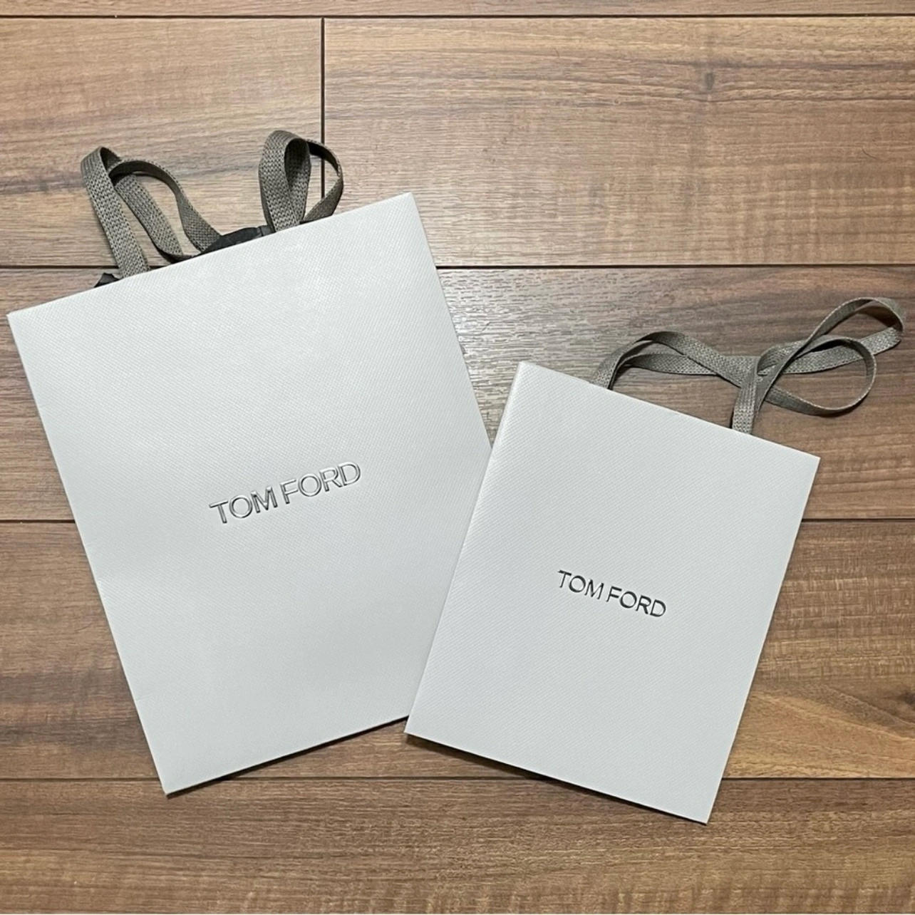 Two Tom Ford gift bags Colour: Grey pebbled Tom Ford logo on both sides of bag. Larger bag comes with Tom Ford tissue paper Sizes: • 9cm x 16.5 cm x 19.5cm • 12cm x 21cm x 25.5cm (tiny hole as pictured)