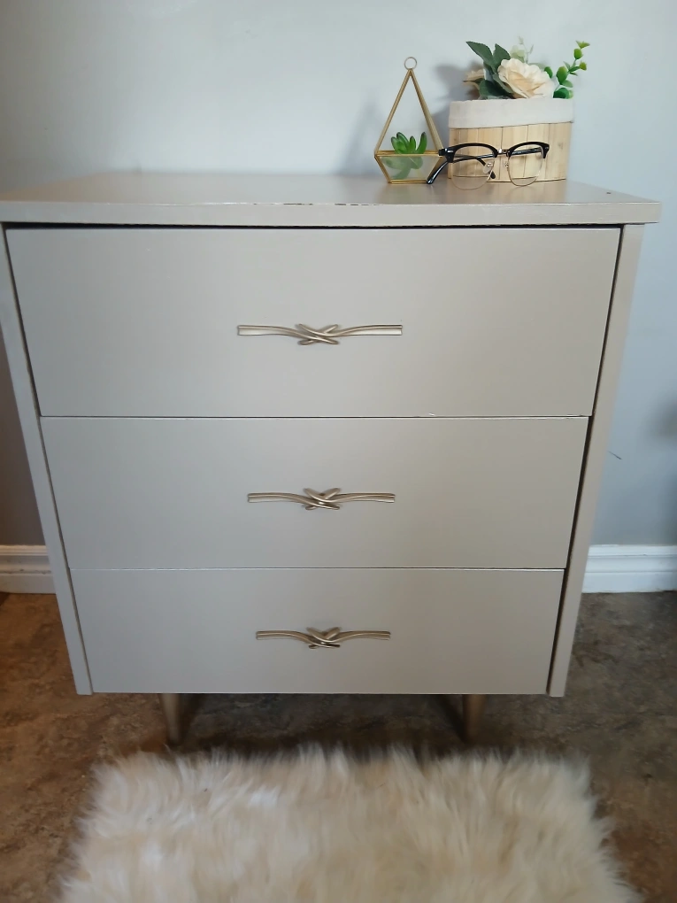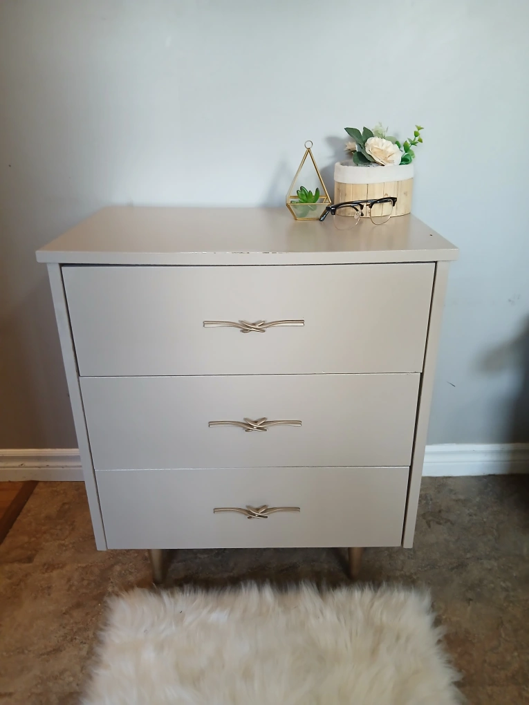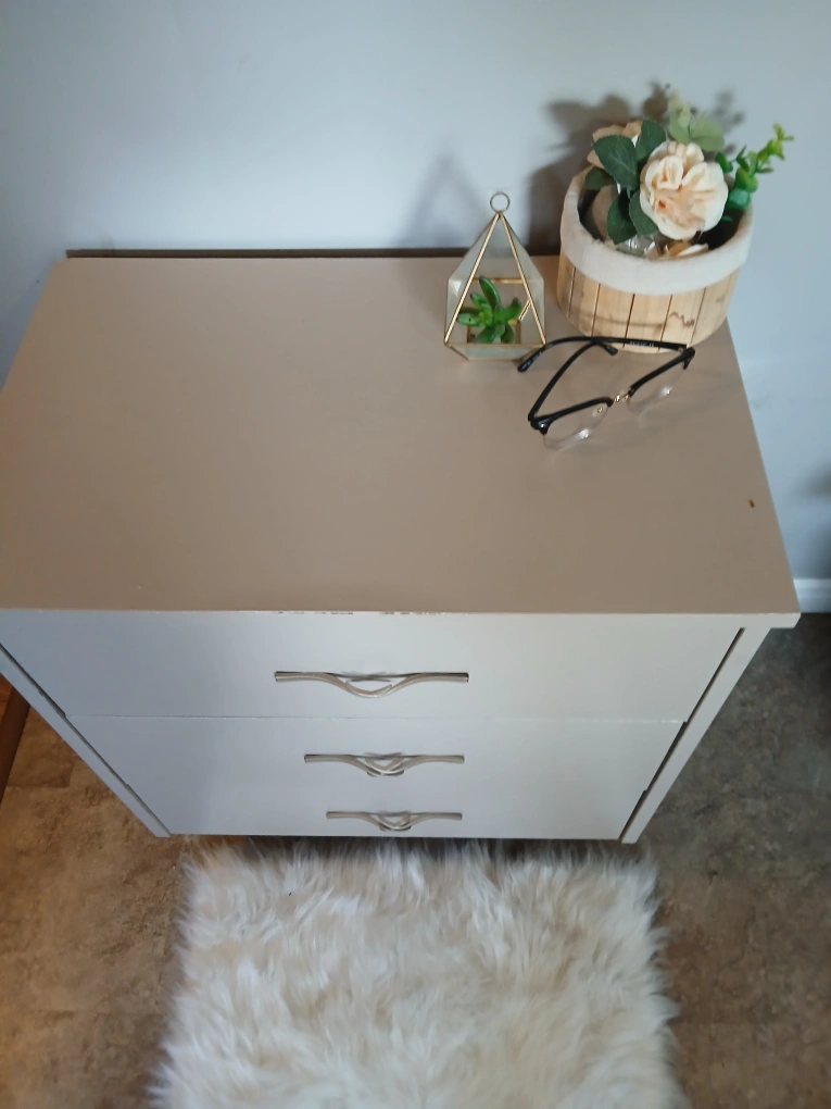 Here's a beige 3-drawer dresser. It's perfect for adding storage to any room. There are some signs of use on the top surface, but the drawers are in good working order. It's a sturdy piece of furniture that will last for years to come