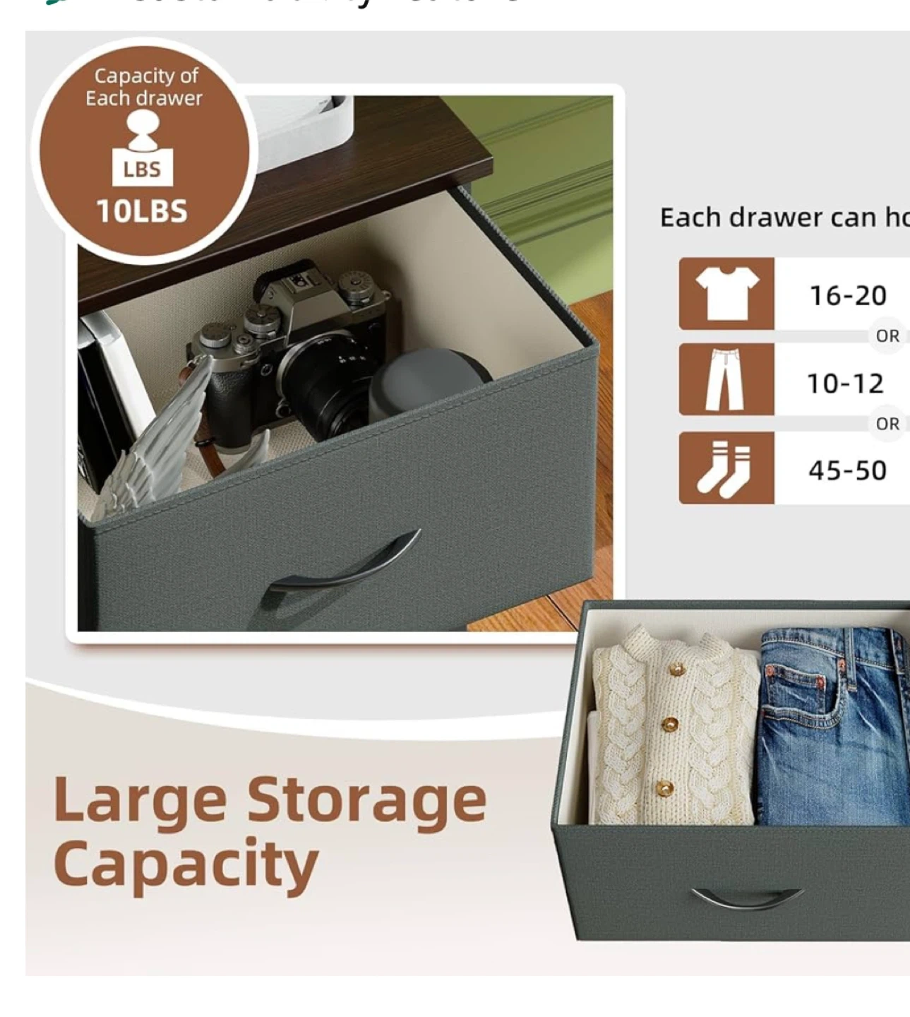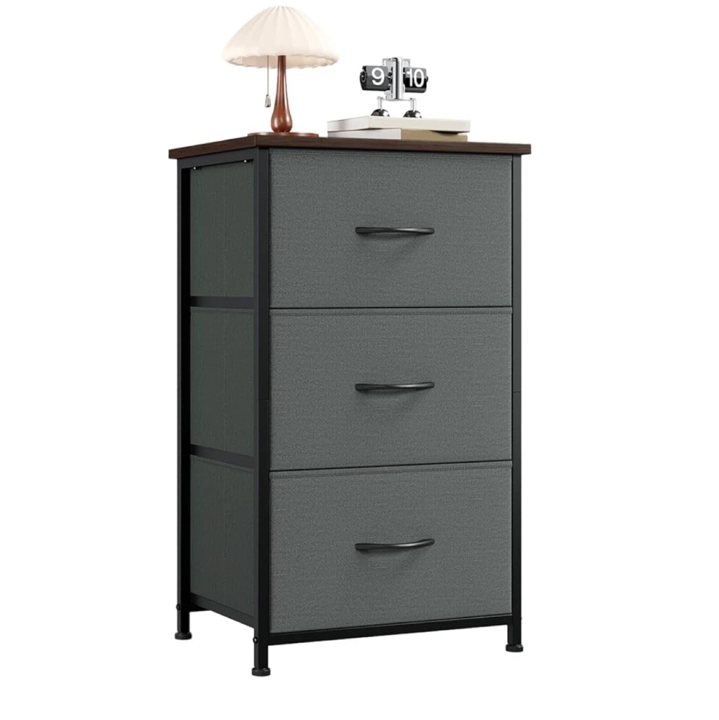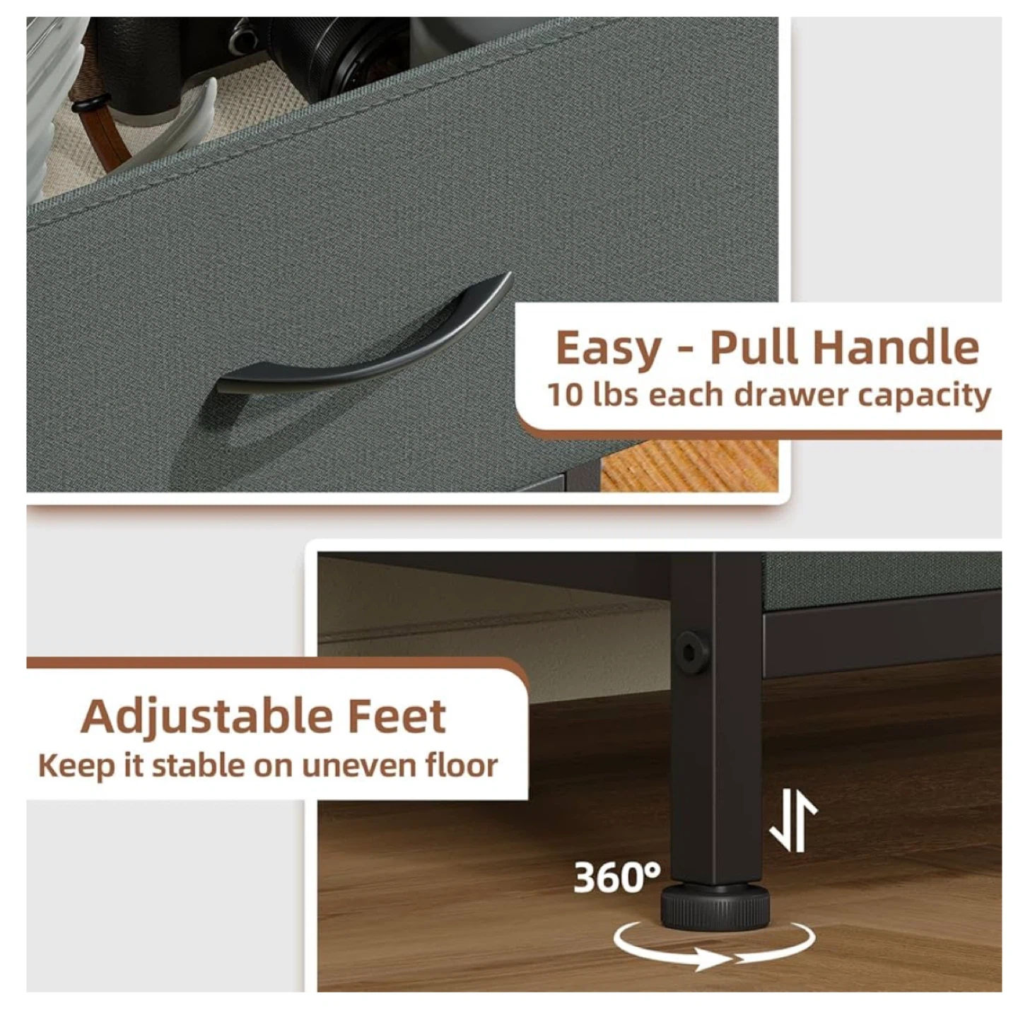 This grey 3-drawer fabric dresser is perfect for adding storage to any room. It features a waterproof top, wear-resistant fabric, and an end-stop design to prevent drawers from being pulled out completely. The anti-tipping straps add extra safety, and the adjustable feet ensure stability on uneven floors. Each drawer can hold up to 10 lbs, offering large storage capacity. Dimensions are approximately 16.5" x 11.8" x 28.1".