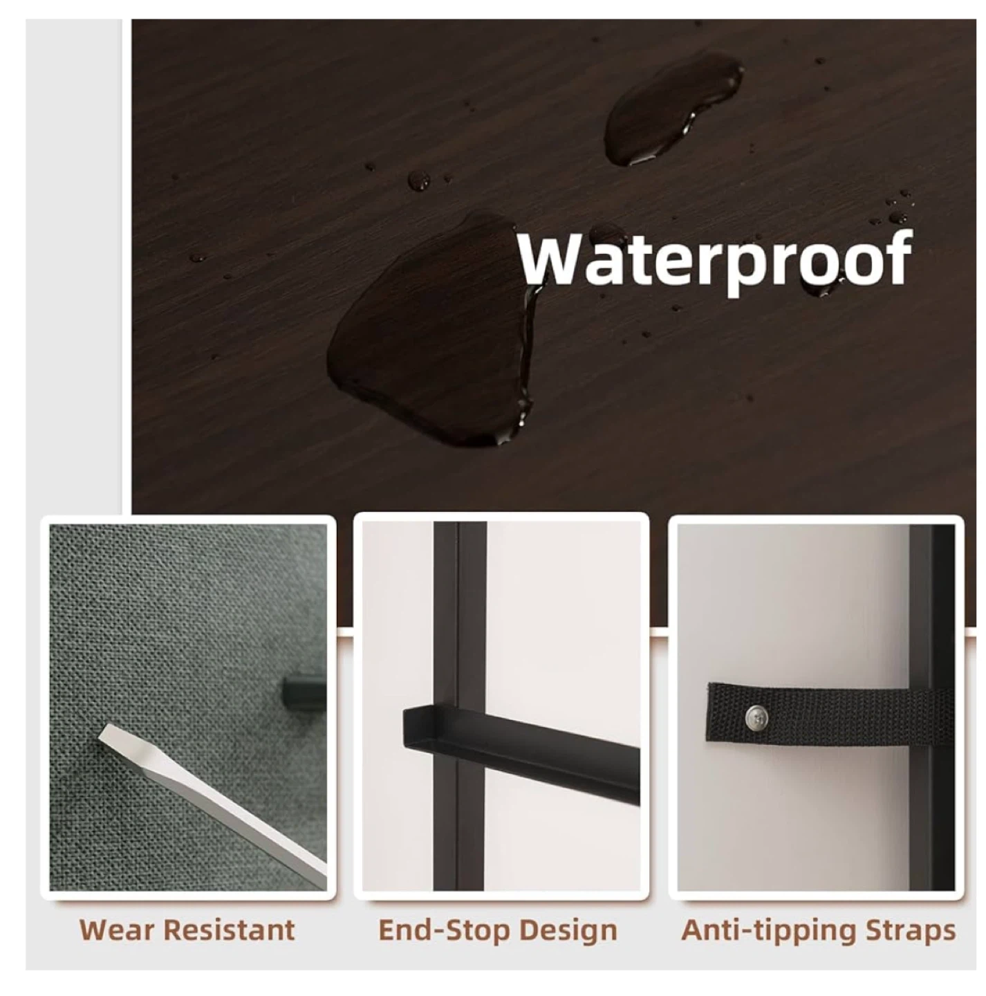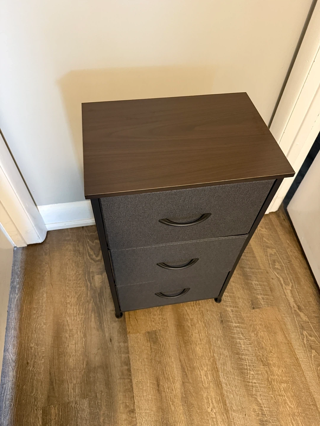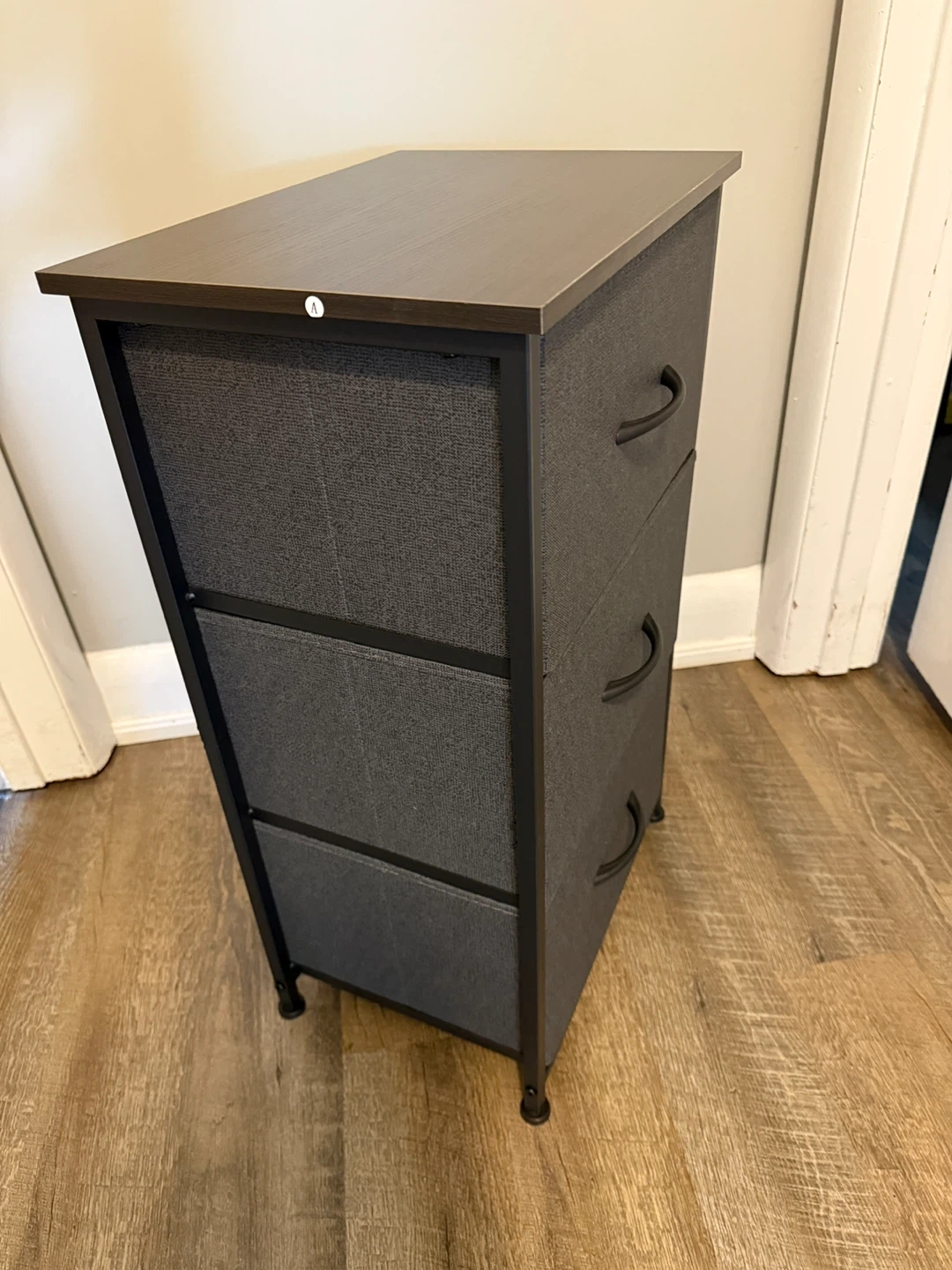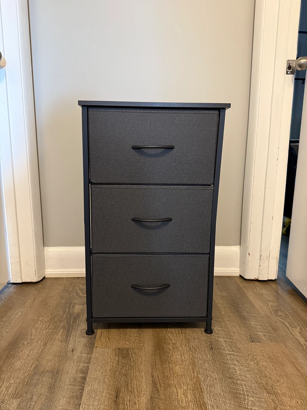 This grey 3-drawer fabric dresser is perfect for adding storage to any room. It features a waterproof top, wear-resistant fabric, and an end-stop design to prevent drawers from being pulled out completely. The anti-tipping straps add extra safety, and the adjustable feet ensure stability on uneven floors. Each drawer can hold up to 10 lbs, offering large storage capacity. Dimensions are approximately 16.5" x 11.8" x 28.1".