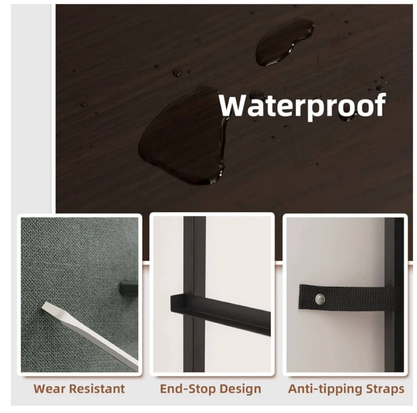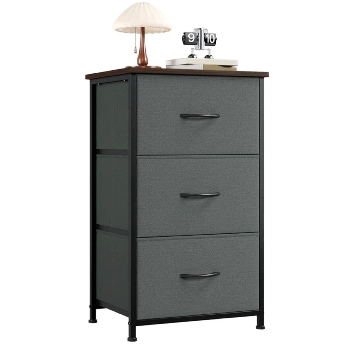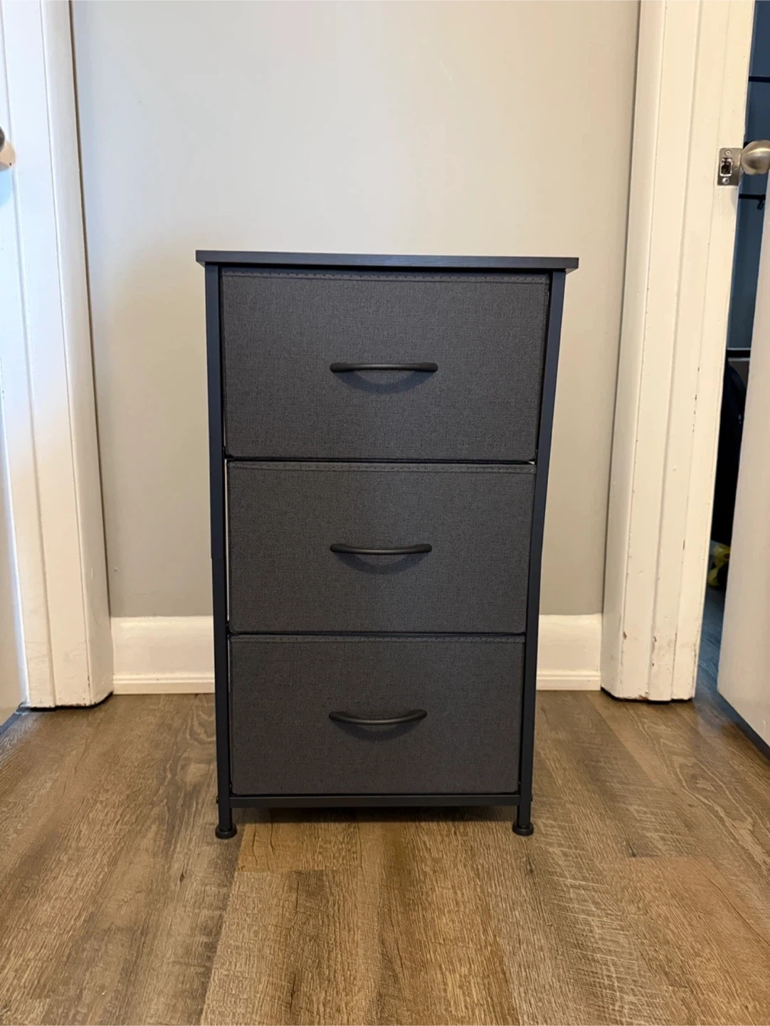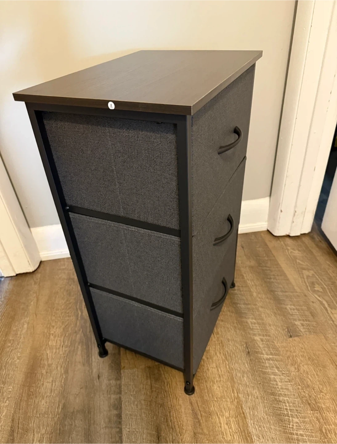 Selling a practically brand new 3-drawer fabric dresser! It's perfect for adding some extra storage to any room. - Features a sturdy metal frame and a waterproof wooden top - Drawers are wear-resistant and each can hold up to 10 lbs - Has an anti-tipping strap for safety and adjustable feet for uneven floors - Dimensions: 28.1" H x 16.5" W x 11.8" D