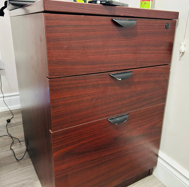 A sturdy 3-drawer filing cabinet with a wood grain finish. Perfect for organizing your home office or workspace. There are some signs of wear on the drawer handles. its available in my brampton house (fernforest Dr)