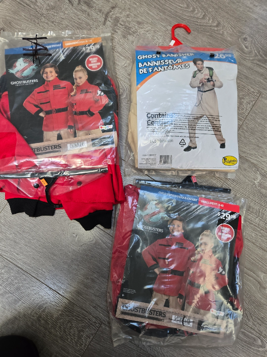 NEW 3 Ghostbusters halloween costume. 1 adult one size and 2 kids size medium n small Brand new never worn Price for all 3. Pick up near 22ns skytrain new west