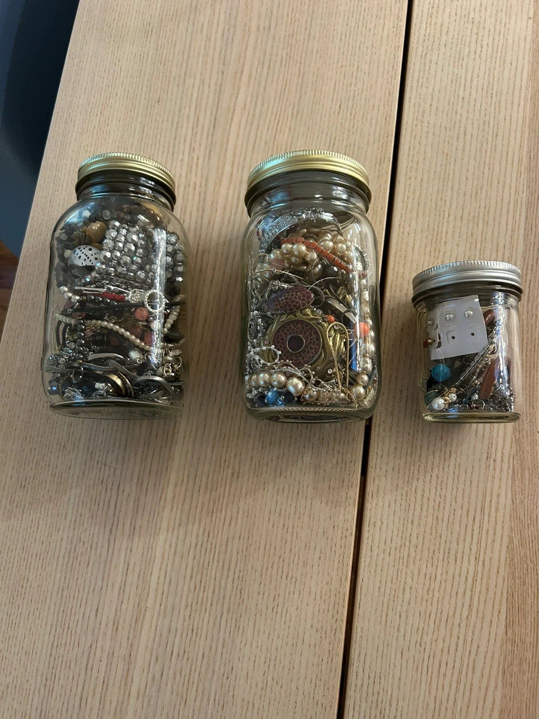 Selling jars of scrap costume jewellery, perfect for crafts or adding to your collection! Each jar is filled with a variety of necklaces, bracelets, earrings, and other fun pieces. Note many pieces are broken and would be great for crafting. Great for anyone looking to add some sparkle to their life or for crafting projects These have been purchased at antique markets and thrift stores.