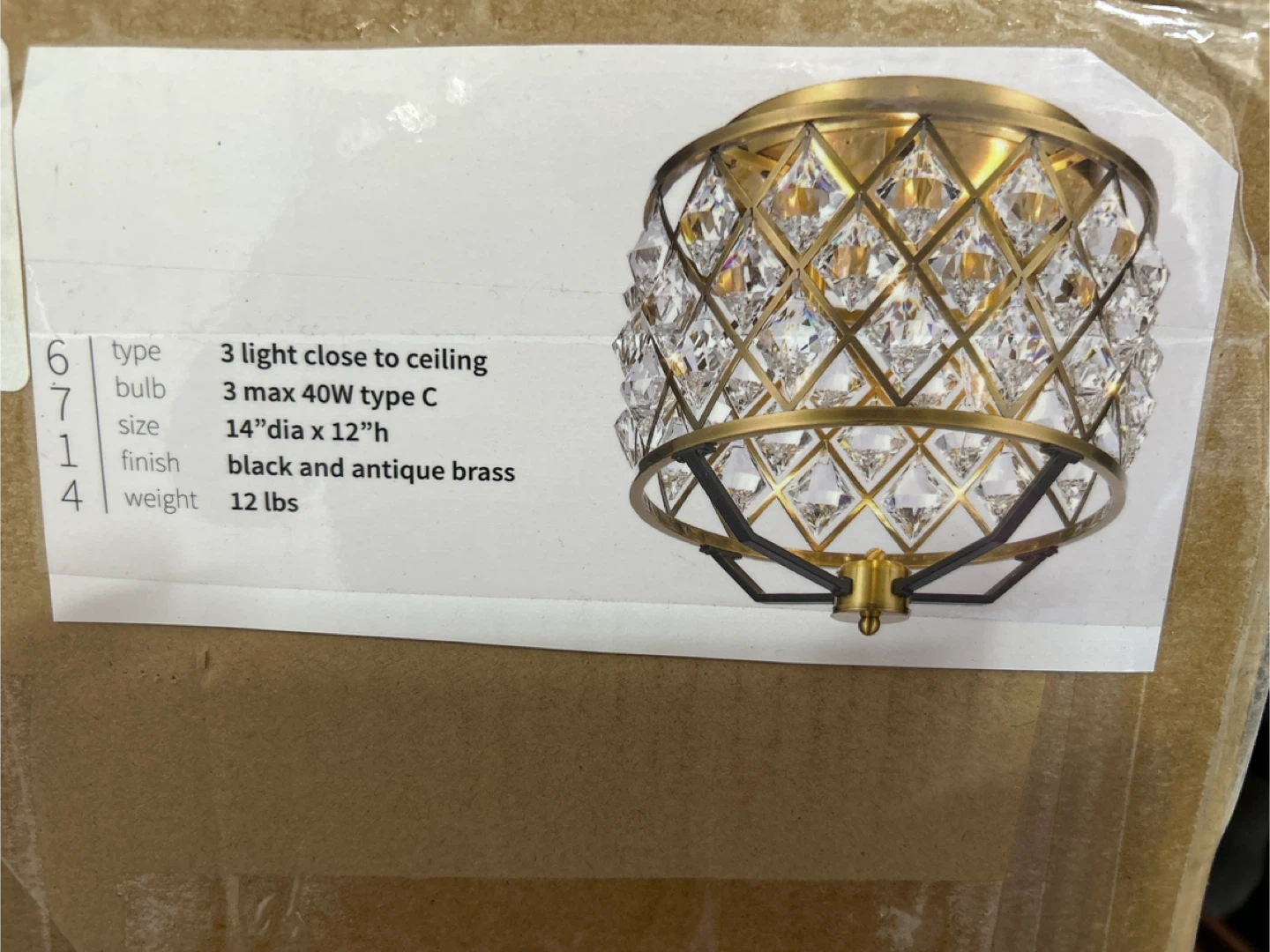 Selling a 3-light close-to-ceiling fixture! It's in black and antique brass finish. The size is 14" in diameter and 12" in height. The weight is 12 lbs. It requires 3 max 40W type C bulbs