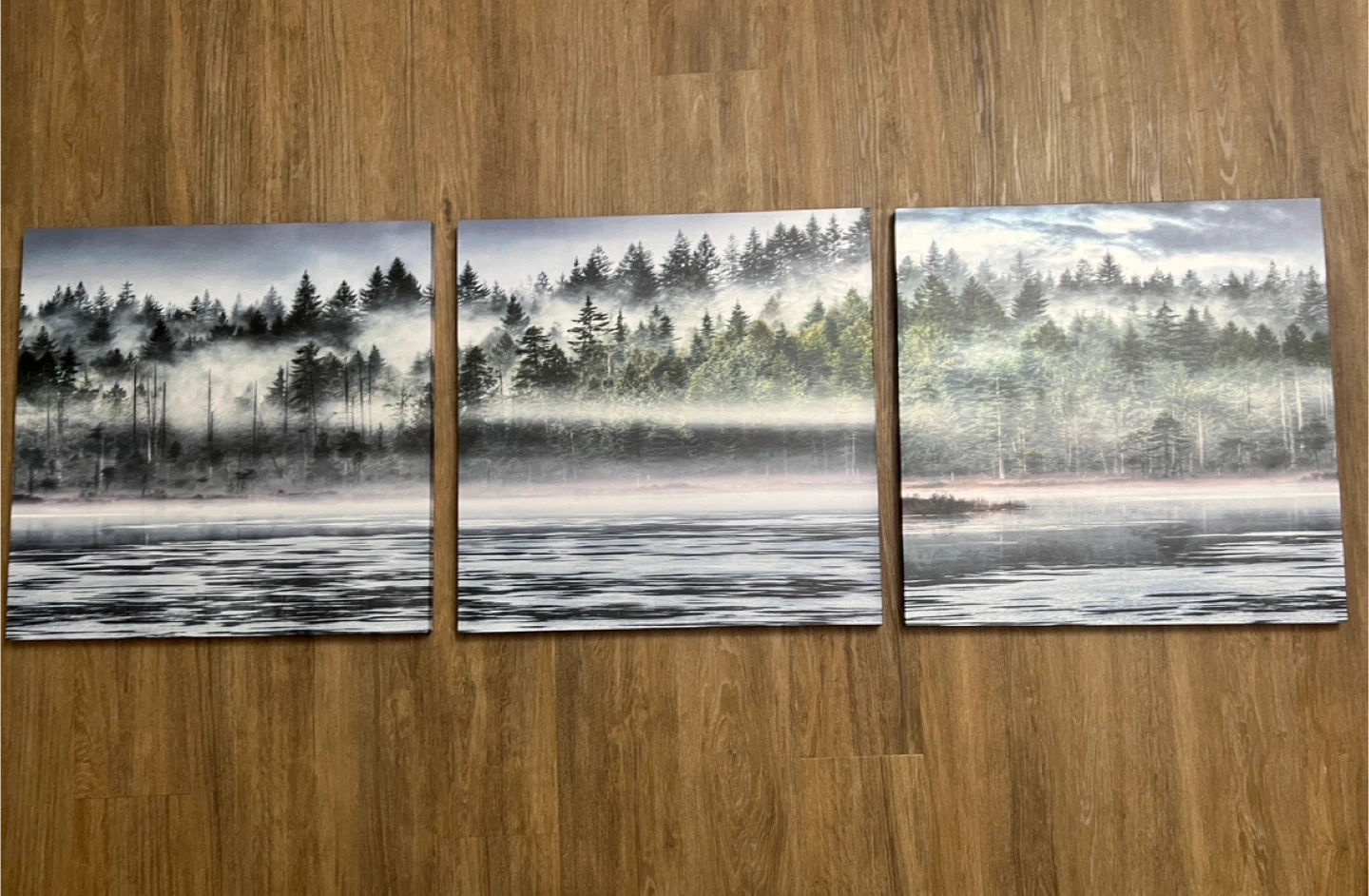 Selling a beautiful 3-piece canvas wall art set featuring a serene forest lake scene. Perfect for adding a touch of nature to your home decor. From Urban barn. 27.5 x 27.5 inches
