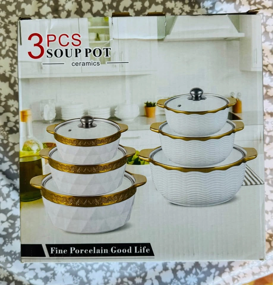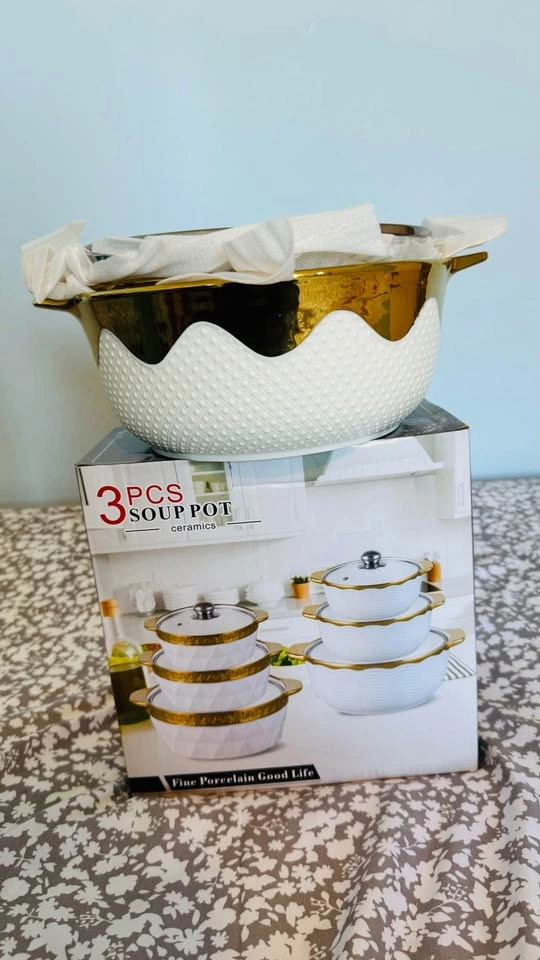 Elevate your dining experience with this elegant 3-piece ceramic soup pot set. Crafted from fine porcelain, this collection is designed to bring both style and practicality to your table. Set Features: · 3 Versatile Sizes: Perfect for serving soups, stews, cereals, and desserts. · Premium Ceramic: Preserves heat effectively and is safe for use in microwaves and dishwashers. · Elegant Design: Adds a touch of sophistication to any meal, from casual family dinners to formal gatherings. · Durable & Easy Clean: Glazed finish ensures effortless cleaning and long-lasting beauty. Ideal For: · Everyday family meals · Serving soups and hot dishes · Entertaining guests · Enhancing your kitchen and dining decor This set perfectly embodies the "Good Life" – a simple promise of quality, beauty, and everyday elegance.