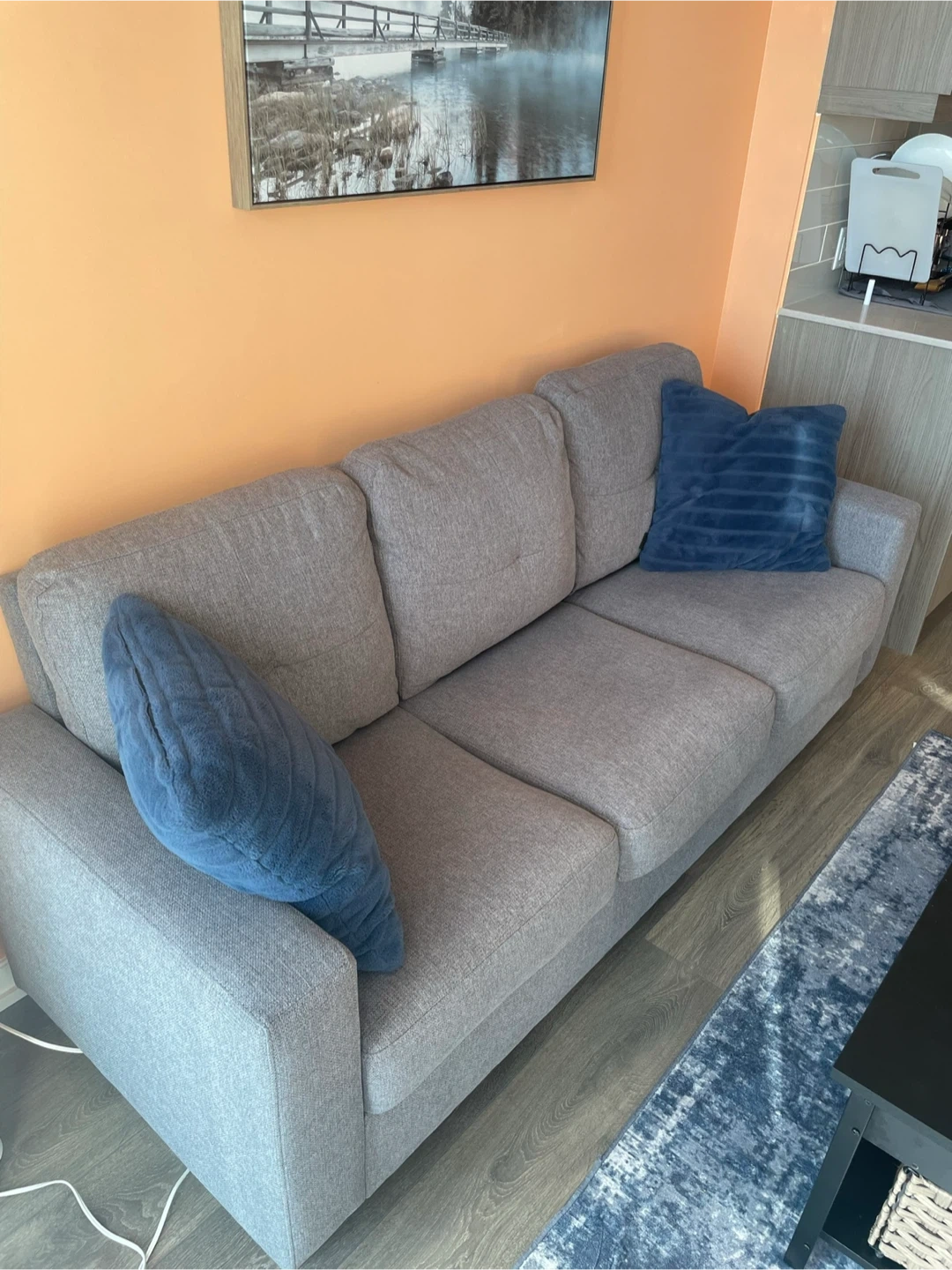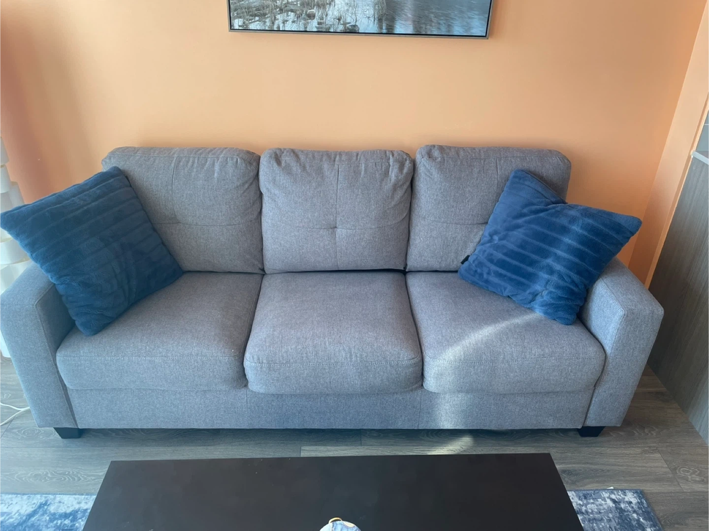 **FREE DELIVERY** (If within 25kms of Fairview mall north York) Gently used 3-seater dark grey sofa for sale! Originally purchased from Structube in fall 2024, this sofa has been well-maintained and is in great condition - clean, no rips, and no pet hair. A steal for its condition and age! Length: 204cms Depth: 79cms Height: 70cms Price: $250 Location: North York Ontario - 401 and DVP