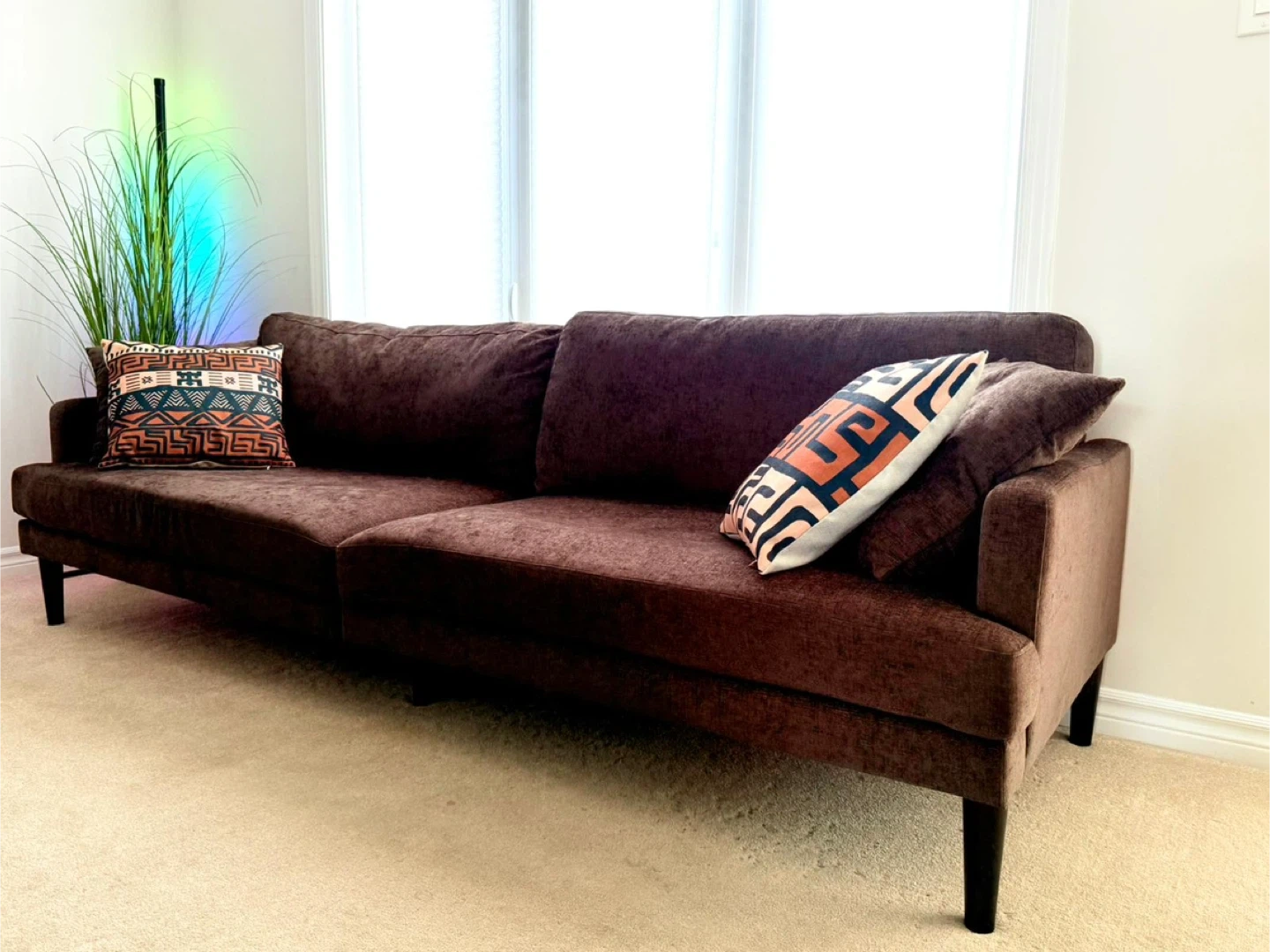 Selling a comfy brown sofa. It's in great condition and ready for a new home! Perfect for a living room or den. Upholstery Colour: Brown Used for less than a year. Location: Orleans Moving sale, wouldn’t fit new space