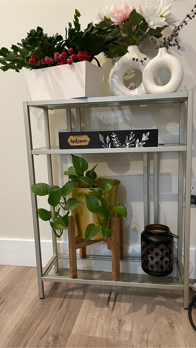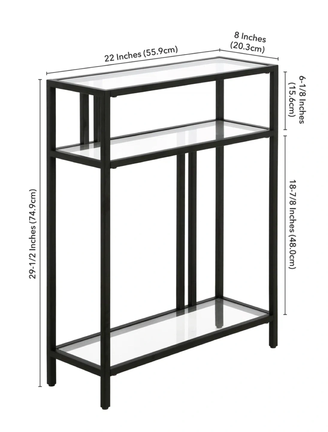 This stylish 3-tier console table is perfect for adding a touch of modern elegance to your entryway or living room. It features a sleek metal frame and clear glass shelves, providing ample space for displaying your favourite decor items. The dimensions are 22 inches (55.9cm) in length, 8 inches (20.3cm) in width, and 29-1/2 inches (74.9cm) in height.