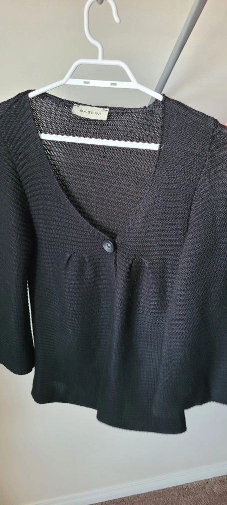 A black cardigan with a single button. The sleeves are 3/4 length. The cardigan is in good condition.Size S and M.