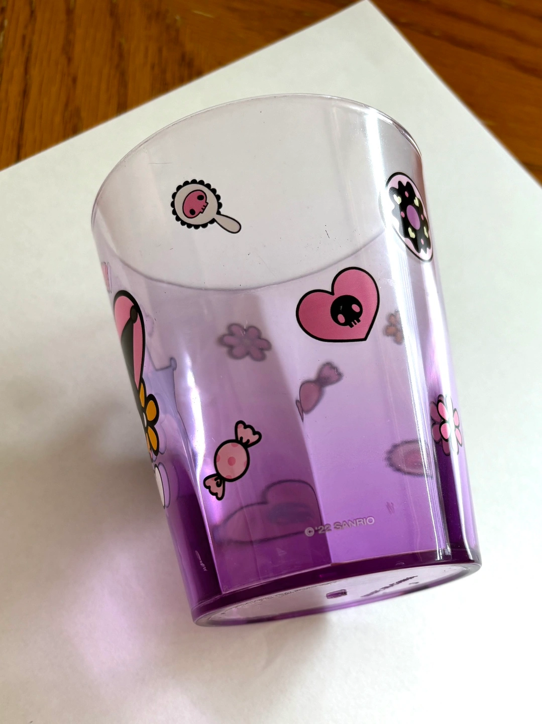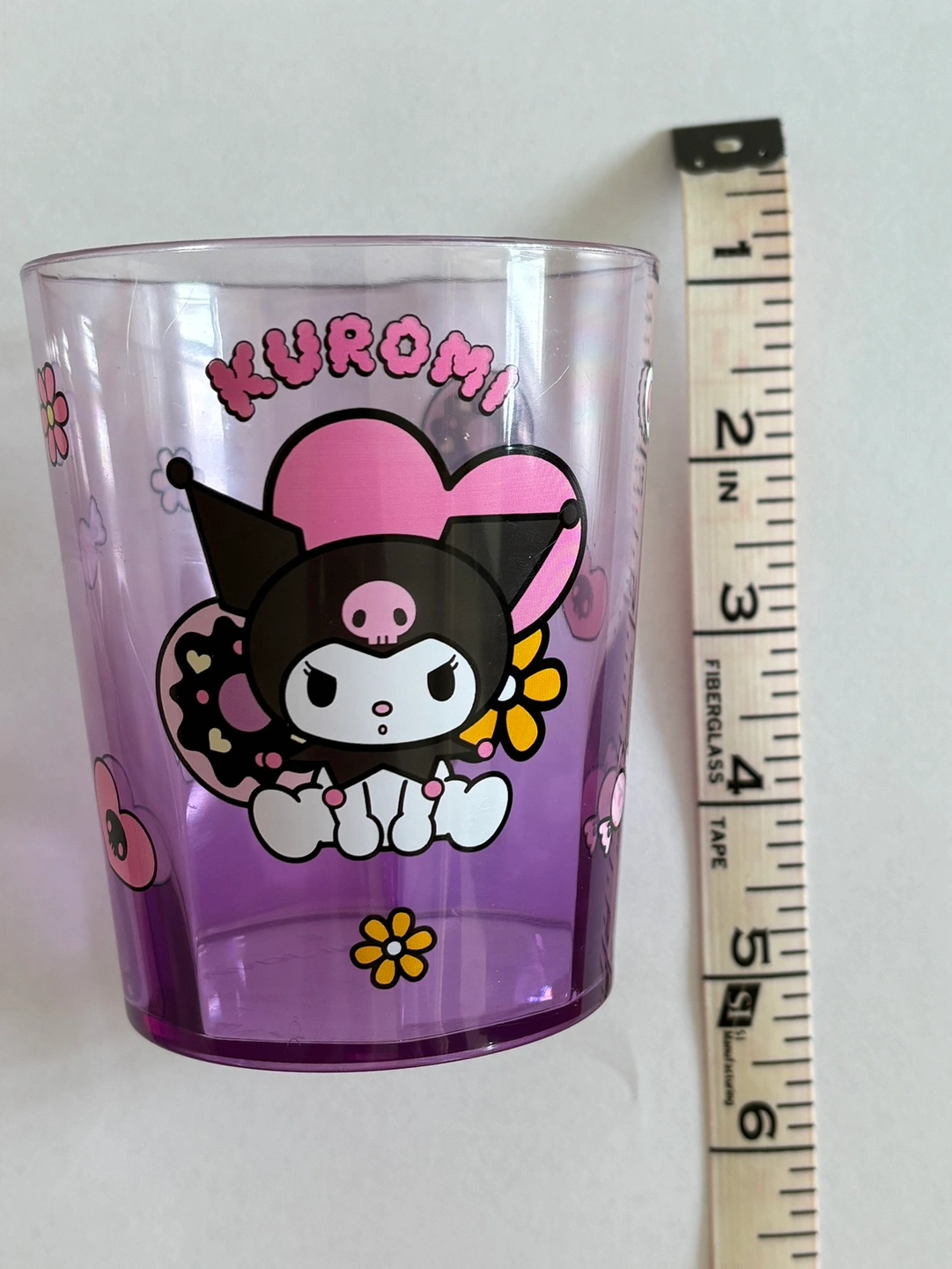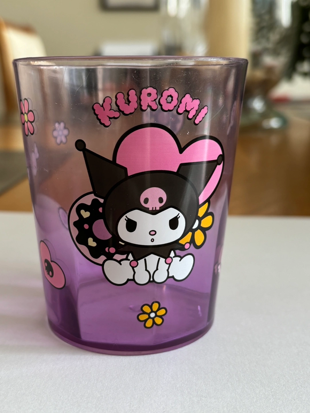 Clear, plastic Sanrio cup with cute Kuromi print on the outside and purple tint. Bought at miniso. Holds up to 1 1/2 cups of liquid (12 oz). Diameter is about 3”, height is about 4”. Can be inspected during pickup. Please see my bio for payment and other pickup places!
