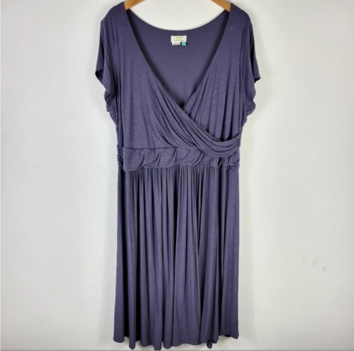 This is a purple wrap dress with short sleeves. It has a v-neck and a ruched waist. The dress is made of a stretchy, soft material. It is a great dress for any occasion.