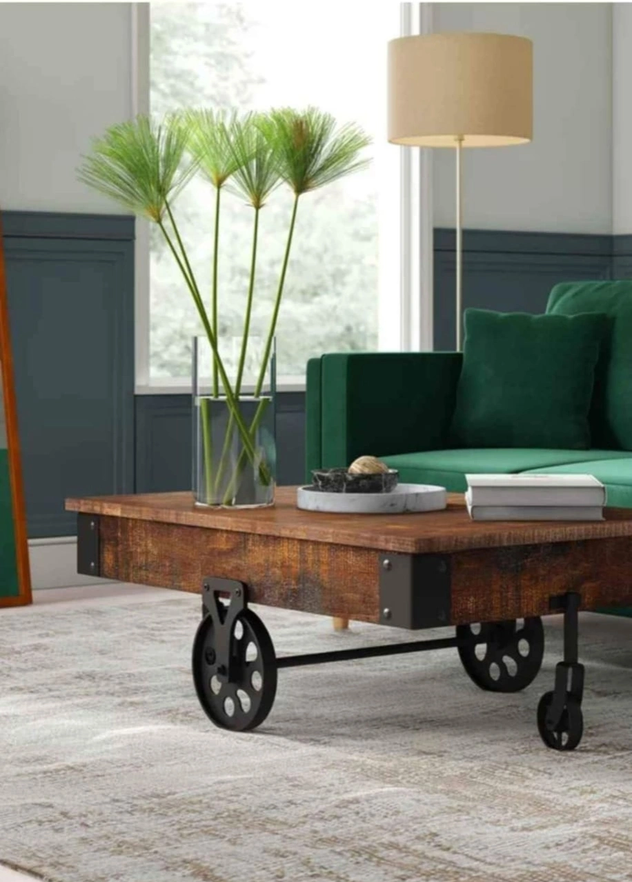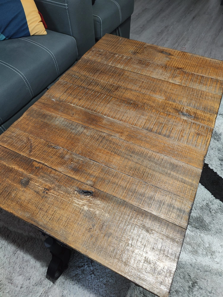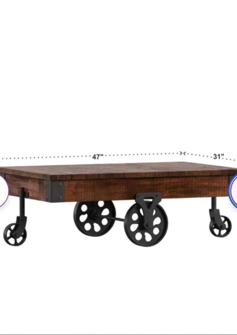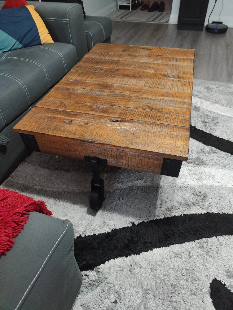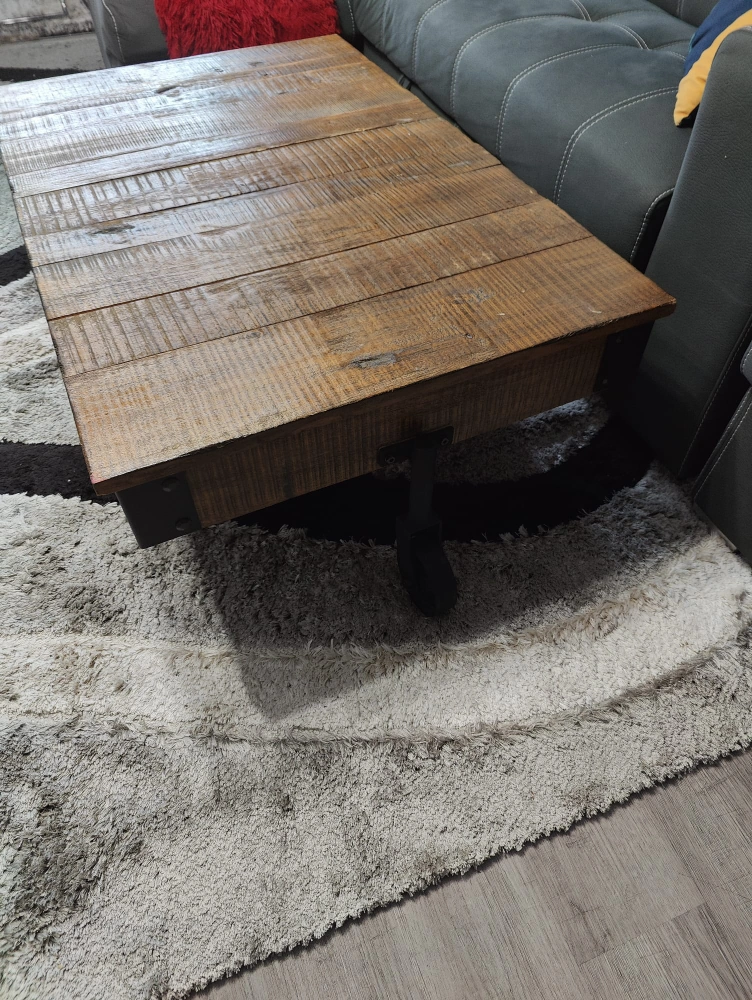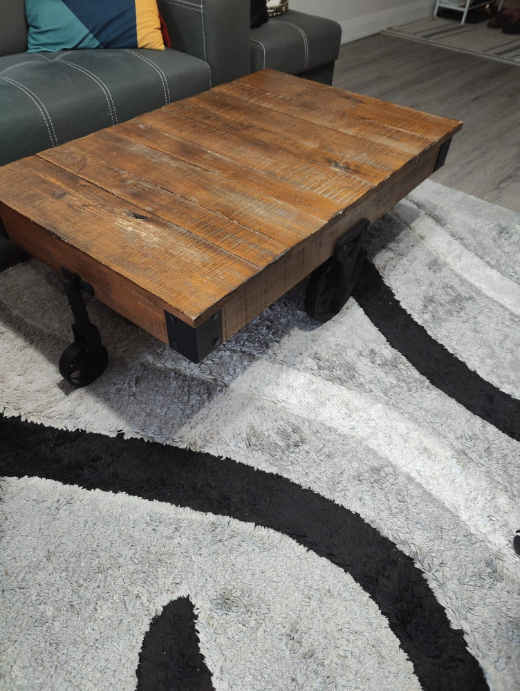 This table is in excellent condition and is a beautiful statement piece for any home. It is perfect for any living room or family room. It features a sturdy wooden top with a distressed finish and a black metal base with wheels. The table is approximately 47" x 31" in size. Originally bought for 799+tax from Wayfair. Pickup Markham/Sheppard. will help with loading, thanks.
