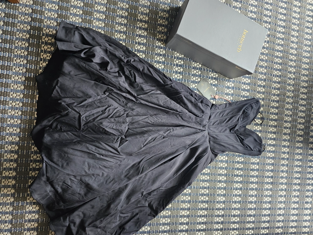 Black satin dress with a one sided sleeve. The dress has a fitted bodice and a flowing skirt. It features a belt with a large buckle. second dress is longer and strapless. willing to sell or trade/swap to a bigger size S-M