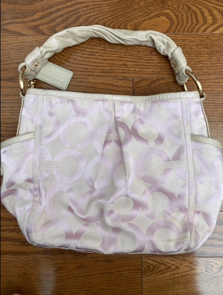 Smoke free pet free home Pick up only yonge & steeles Item brought to driveway Genuine Coach Bucket bag with soft shoulder strap, in unique rose pale pink colour. Two side pockets for water and sunglasses, spacious interior with compartments and zipper pocket. Snap button closure Imperfections pictured. Condition 7/10