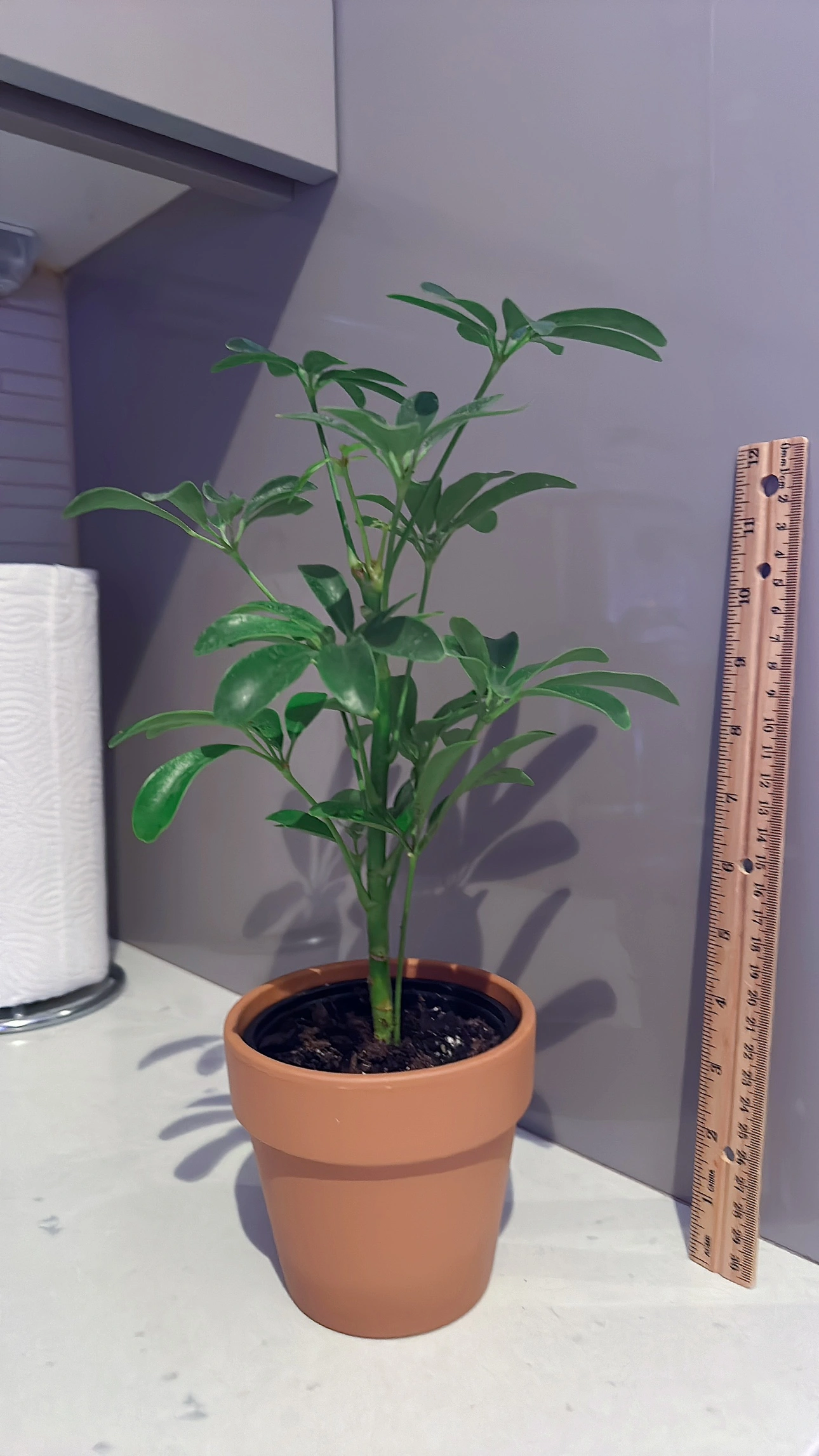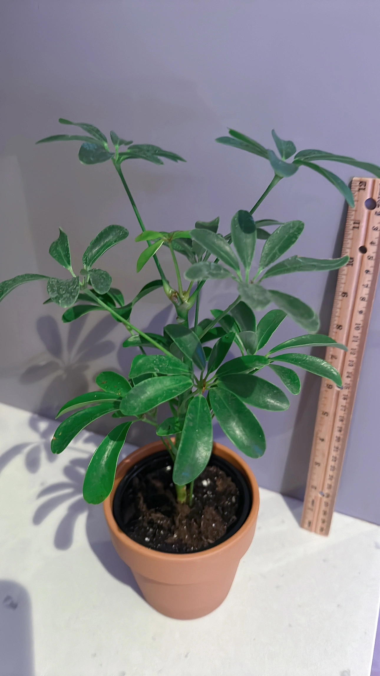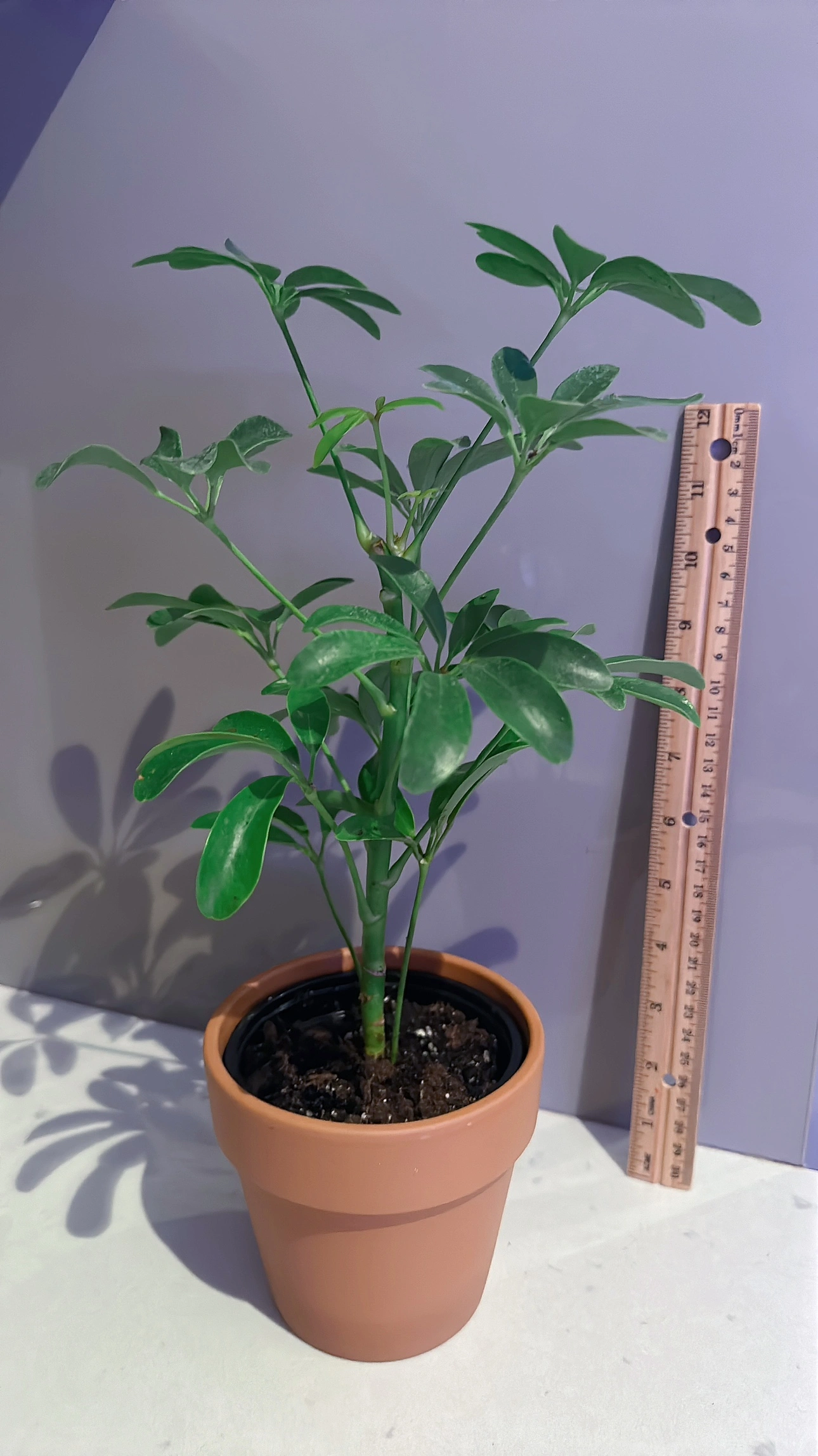 A small potted plant in a terracotta pot. Over 1 ft tall.