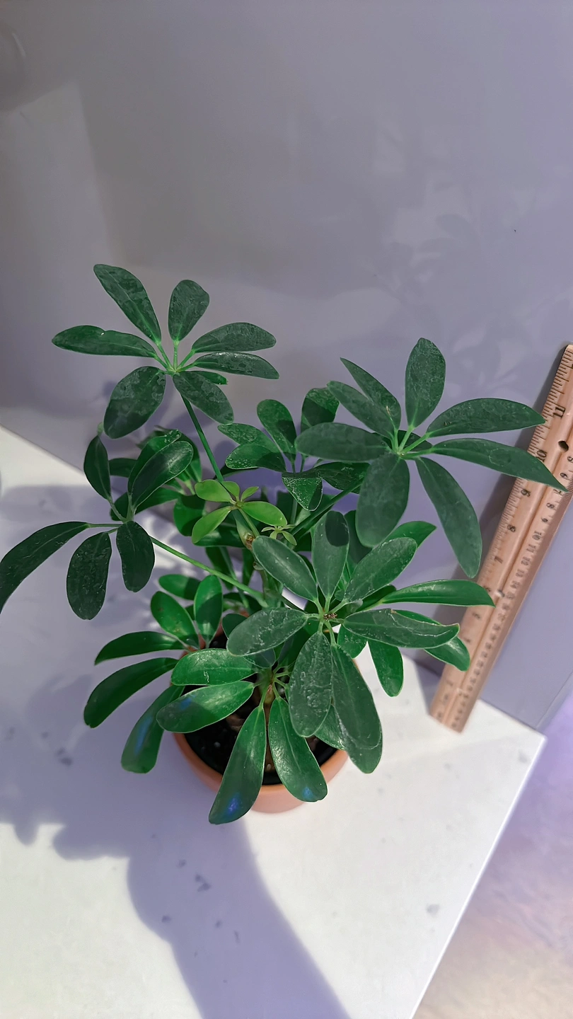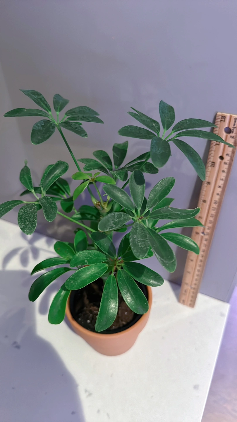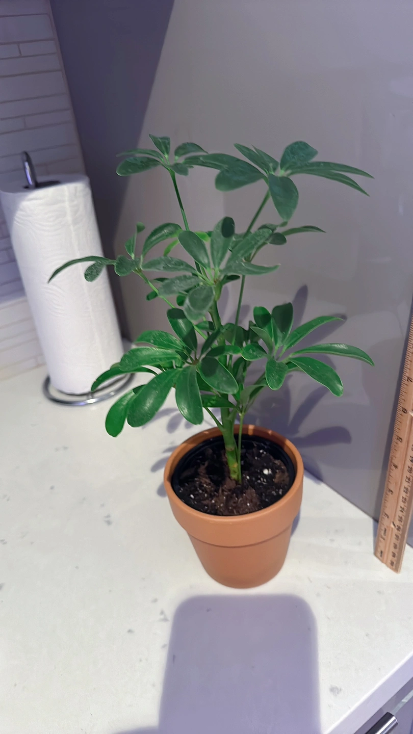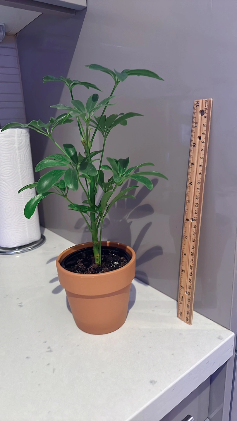 A small potted plant in a terracotta pot. Over 1 ft tall.