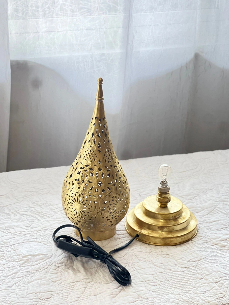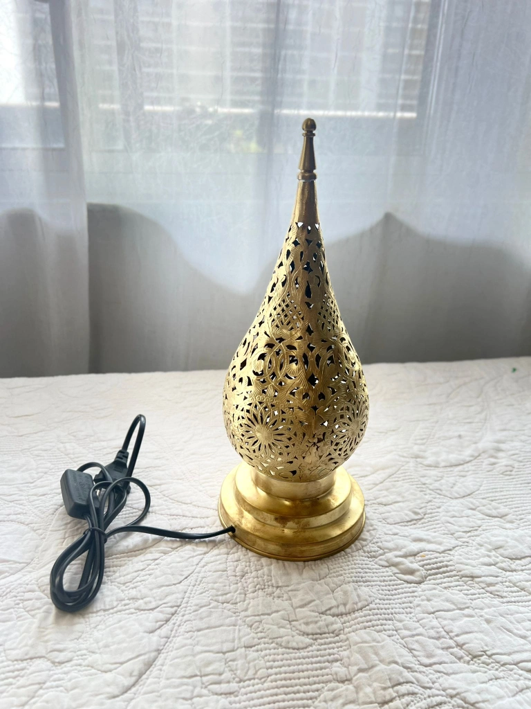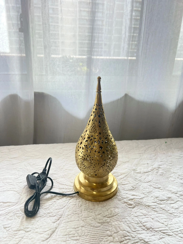 Beautiful brass Moroccan lamp with intricate detail.