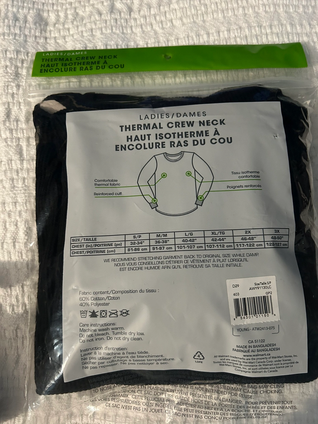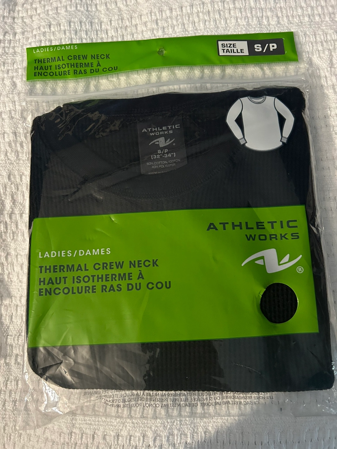 Size S/P, black thermal long sleeve top with a crew neck and a tag that reads "Athletic Works" Paid 12$ plus tax asking 6$ Pick up Main Street and 16th Markham