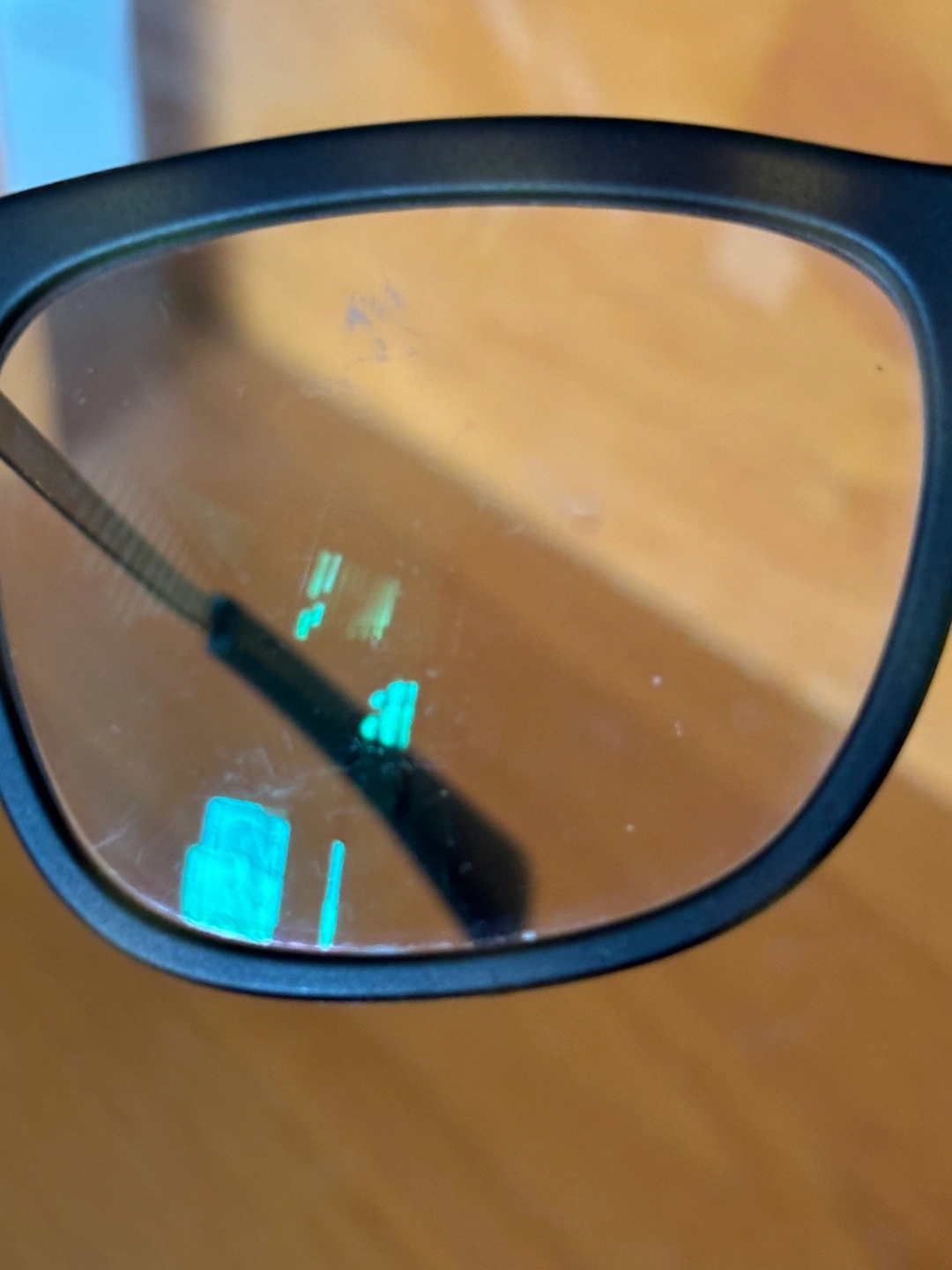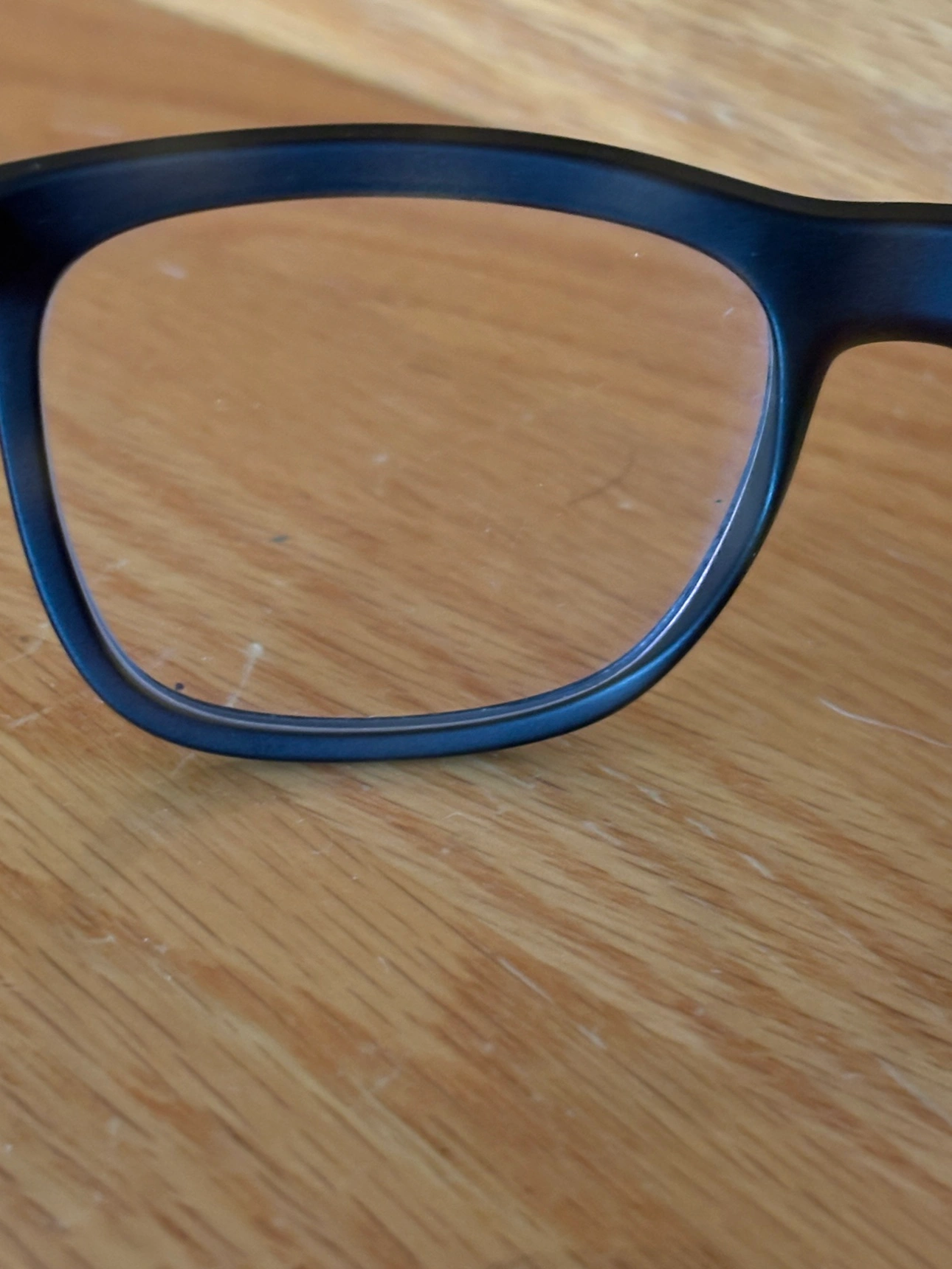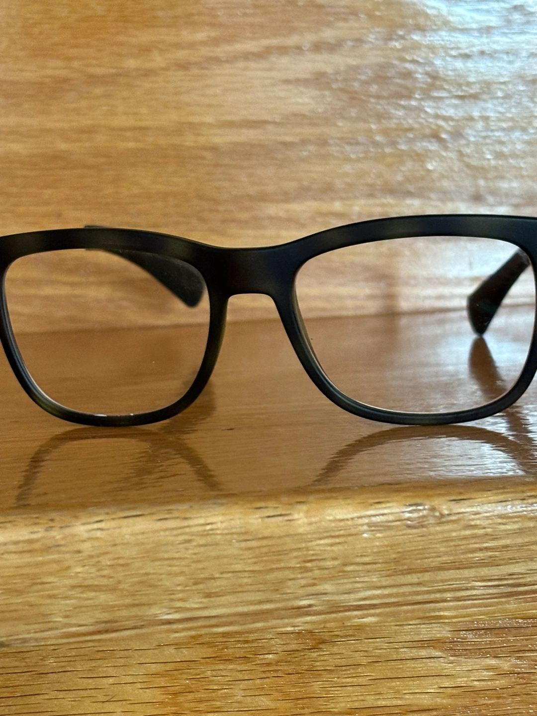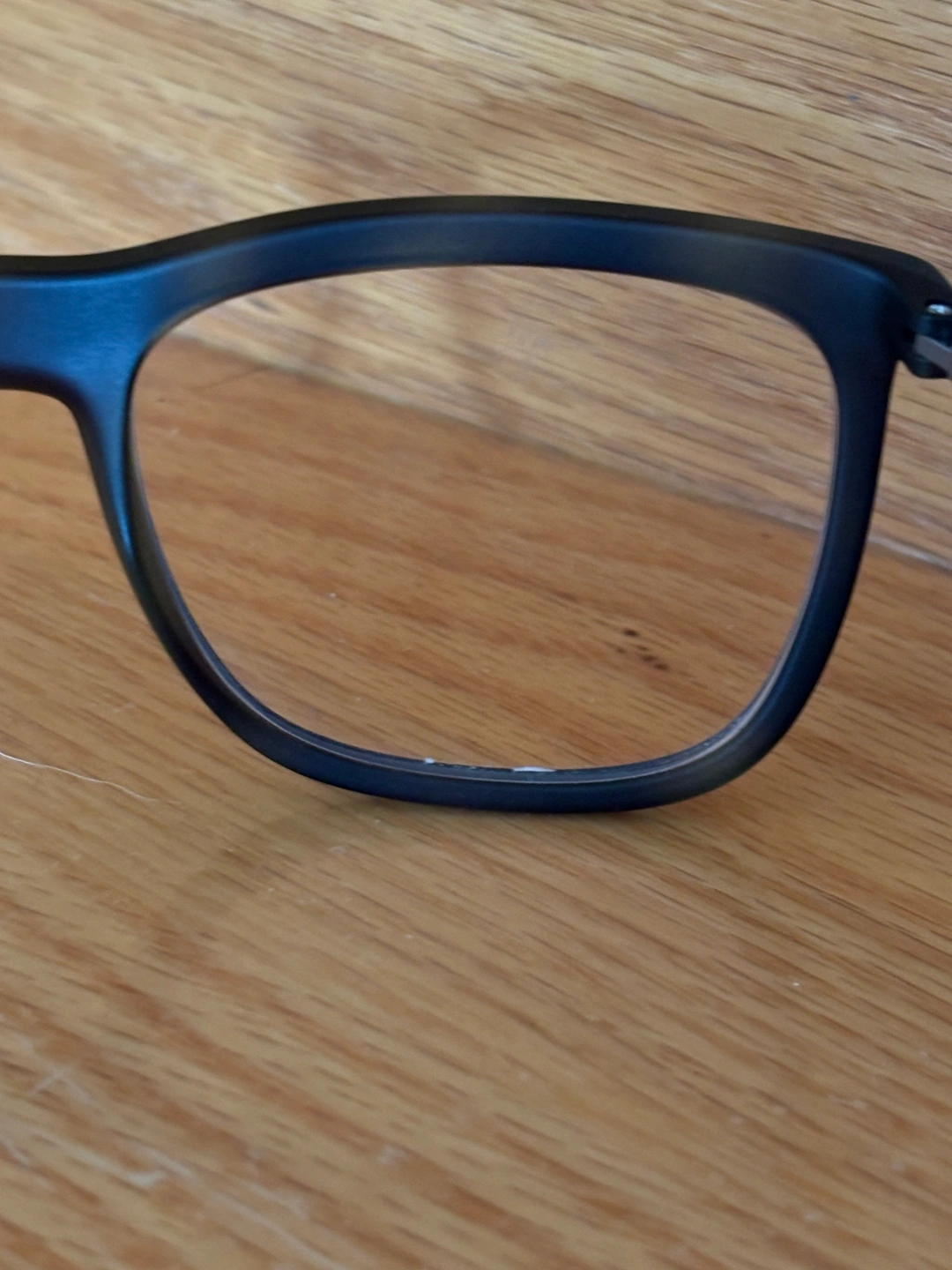 Black rectangular frame with clear lenses. Made in China. Issue with one lense that has something on it but you can get optical store to insert your own new lenses Cash and pick up only