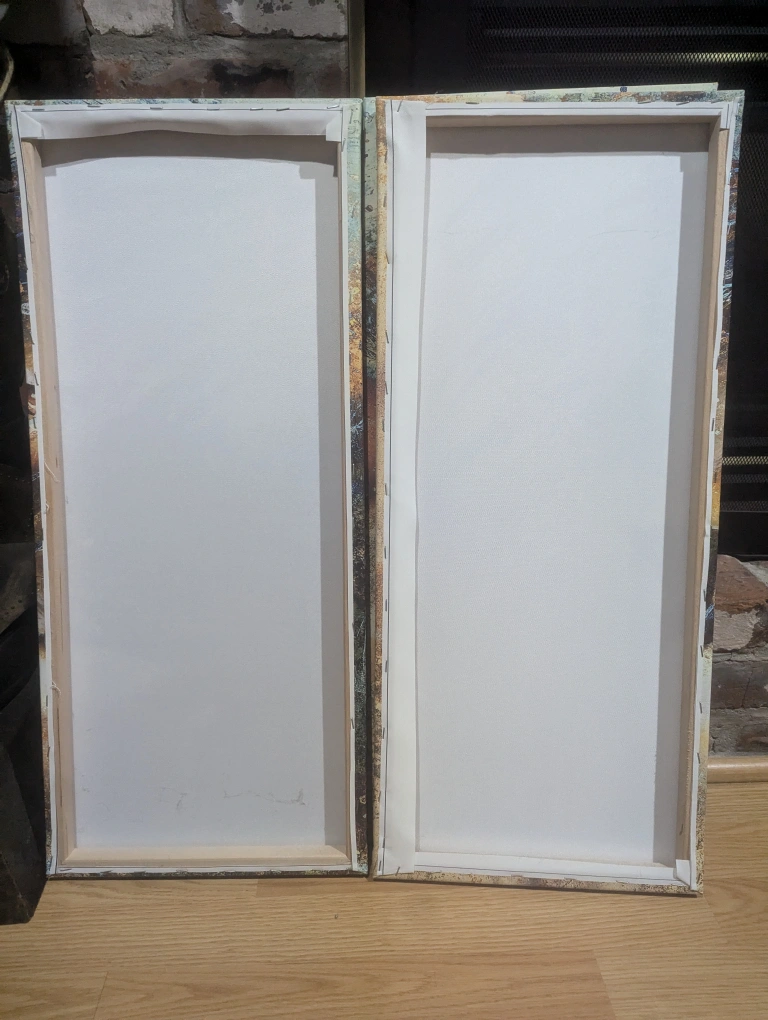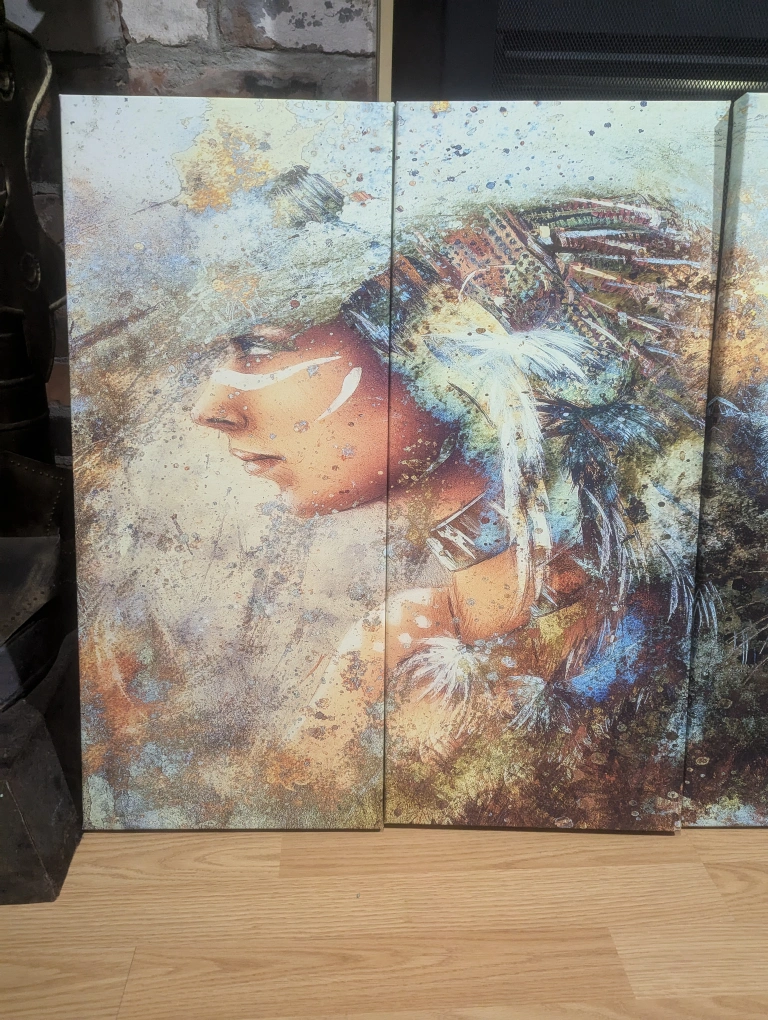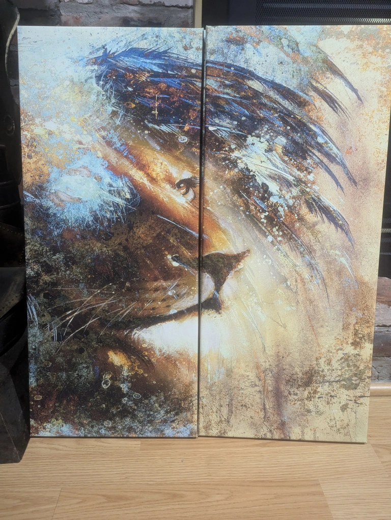 A four-piece canvas art set of a woman and a lion. Each piece is a separate canvas.Its total dimensions are 48 inches long and 28 inches wide.