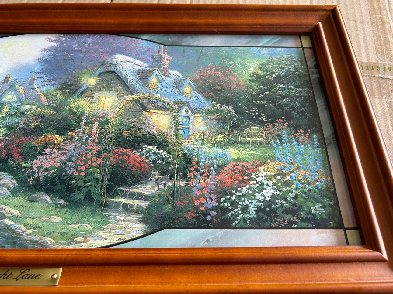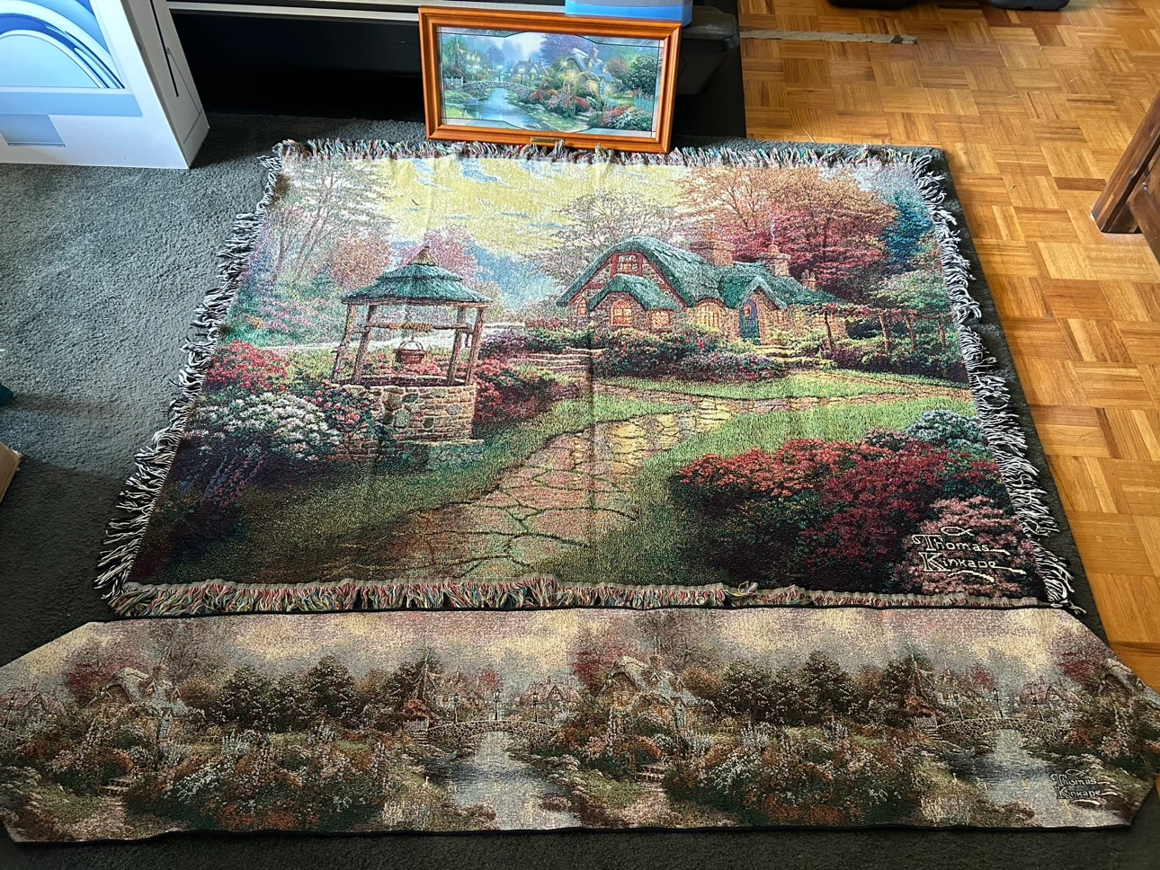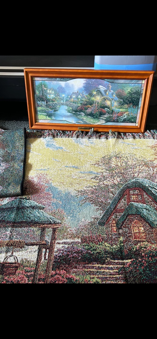 What a collection! Beautiful and vivid detail. 1. Gorgeous 4 foot by 5 foot throw can be used as a blanket, tapestry or rug! What vivid detail. 2. Thomas Kinkade art. Limited edition numbered Bradford Exchange piece circa 2004. Framed in fine wood frame. 11 inch high by 23 inch wide. 3. Attractive table runner. Get all 3. Great condition. Price FIRM.